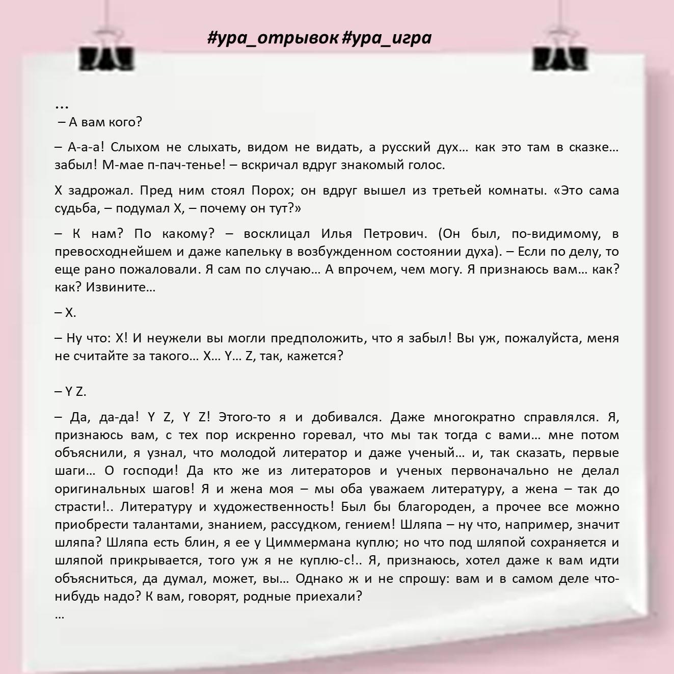 Задача : узнать по отрывку книгу, автора, и как зовут героя/героиню, который/ая в отрывке прячется за X, а во втором случае за XYZ = ФИО