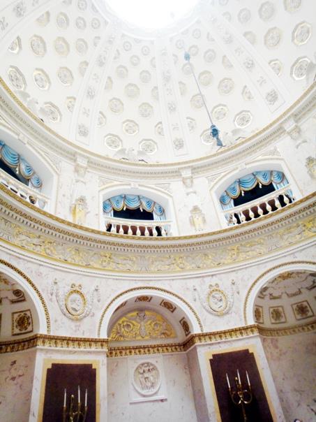 Роспись купола выполнял талантливый художник-декоратор Пьетро Гонзаго. Уникальный по тем временам живописец, умевший создавать оптический эффект, настолько реалистичный, что на наружной галерее дворца бывало птицы врезались в стену и собаки носы себе расшибали, пытаясь забежать в нарисованную галерею. Та роспись, к нашему сожалению и счастью ласточек, в изобилии гнездящихся в Павловске, не сохранилась.