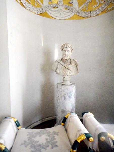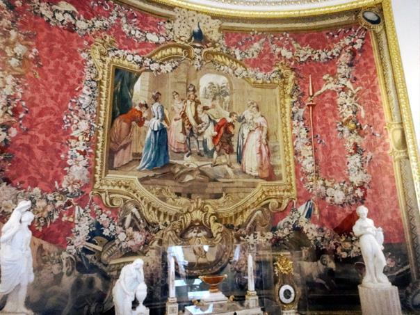 Здесь висят старинные гобелены французской работы, подаренные Павлу и Марии Фёдоровне Людовиком XVI во время путешествия по Европе. Великокняжеская чета вояжировала инкогнито, но тем не менее, несмотря на отсутствие телевидения и интернета, вся европейская знать прекрасно (простите за каламбур) знала, кто скрывается под именем графа и графини Северных, и наперегонки волокла подарки будущему властителю этой ужасной варварской Московии.