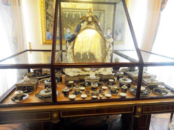 Там же на специальном столике фарфоровый туалетный прибор, подаренный Марии Фёдоровне Марией-Антуанеттой. В приборе шестьдесят четыре предмета. Должно быть, назначения их знала лишь венценосная французская модница, понимавшая толк в роскоши. А для простого смертного разобраться для чего все эти флакончики, баночки, шкатулочки и чашечки — задача невыполнимая.
