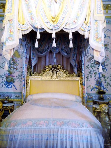 Пышнотелая кровать под балдахином, золочёные купидоны и прочая нега. Вообще, парадная спальня это своего рода бутафория — никто и никогда не спал на этой кровати. Только пыль прислуга смахивала. Функция у аппартамента была одна — его демонстрировали гостям.