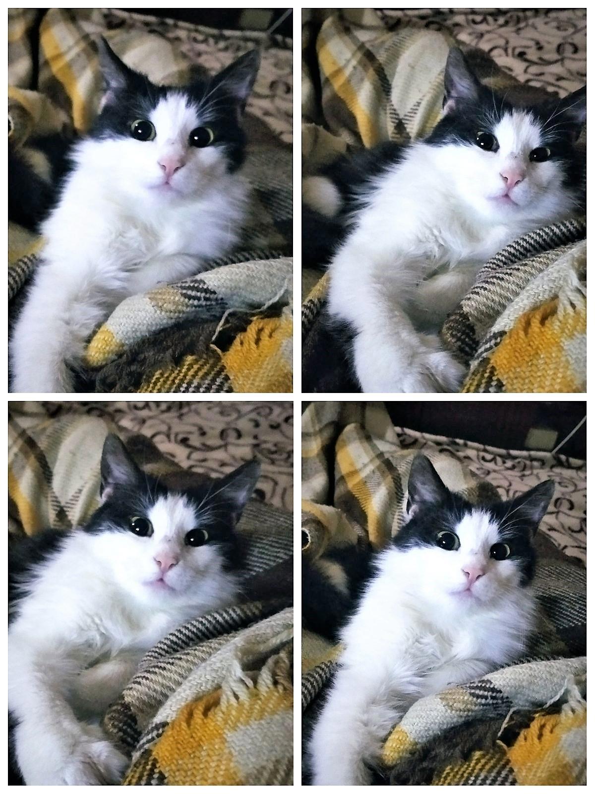 Позже пытаюсь накормить кошку вареным мясом и дать воды, но она не ест и не пьёт. Я не настаиваю. Ночью робко залезает ко мне в постель, но тут же в панике убегает. Утром нахожу её всё в той же кладовке, беру на руки, разговариваю, и снова предлагаю питьё и пищу. Кошке, кажется, получше, она много пьёт и съедает немного курицы. Чешу и глажу кошку, она включает тракторець и трётся об ноги, но теперь она боится каждого громкого звука и, чуть что, прячется. Я виновата перед нею, поэтому стараюсь компенсировать вину вкусной едой, теплом и лаской.