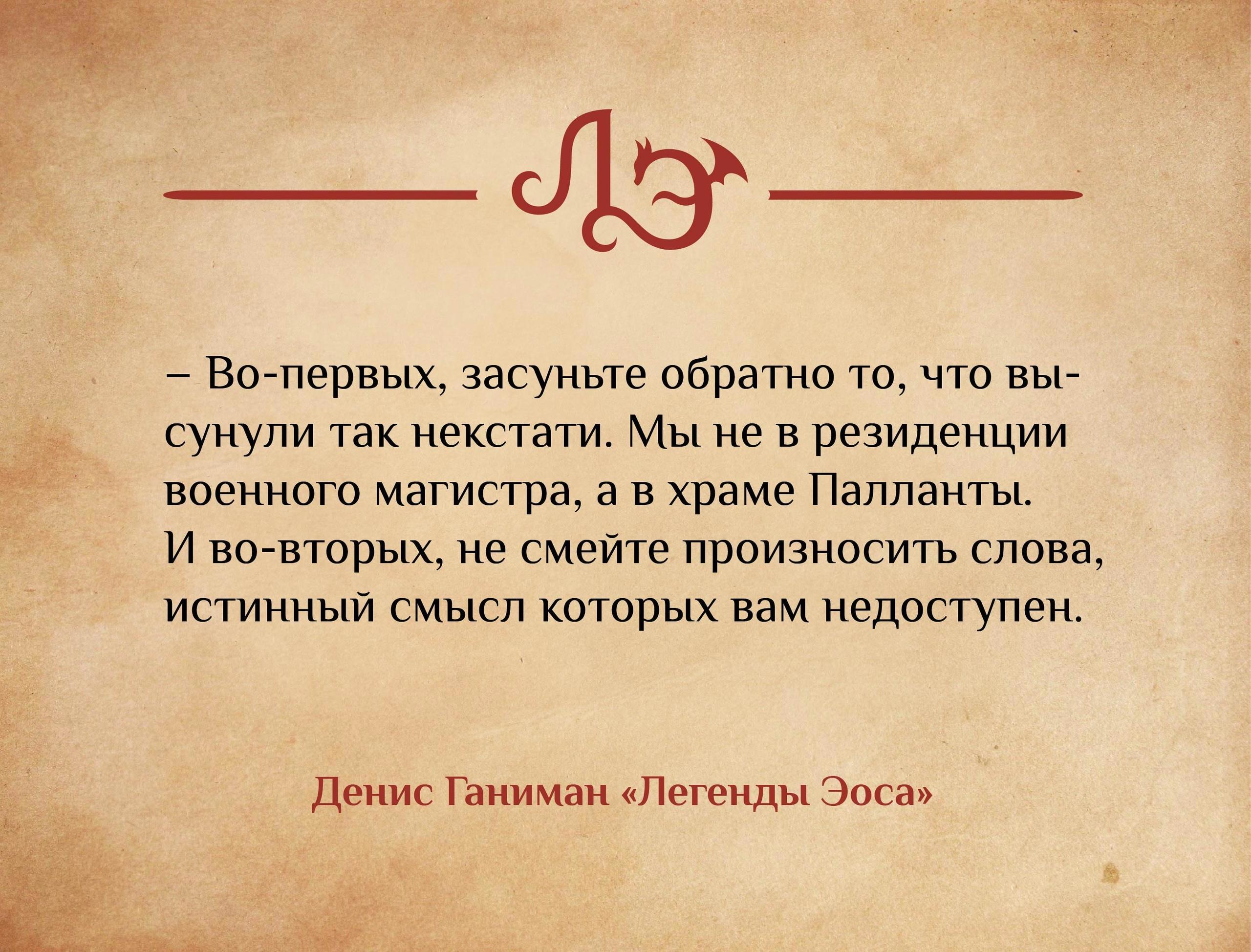 Автор: Ганиман ДенисВ "Легендах Эоса" есть место не только мудринкам и героическим свершениям. Юмор там тоже имеется. Разный. Иногда изящный, а иногда простой, но заставляющий улыбнуться. Проверено на бета-ридерах.