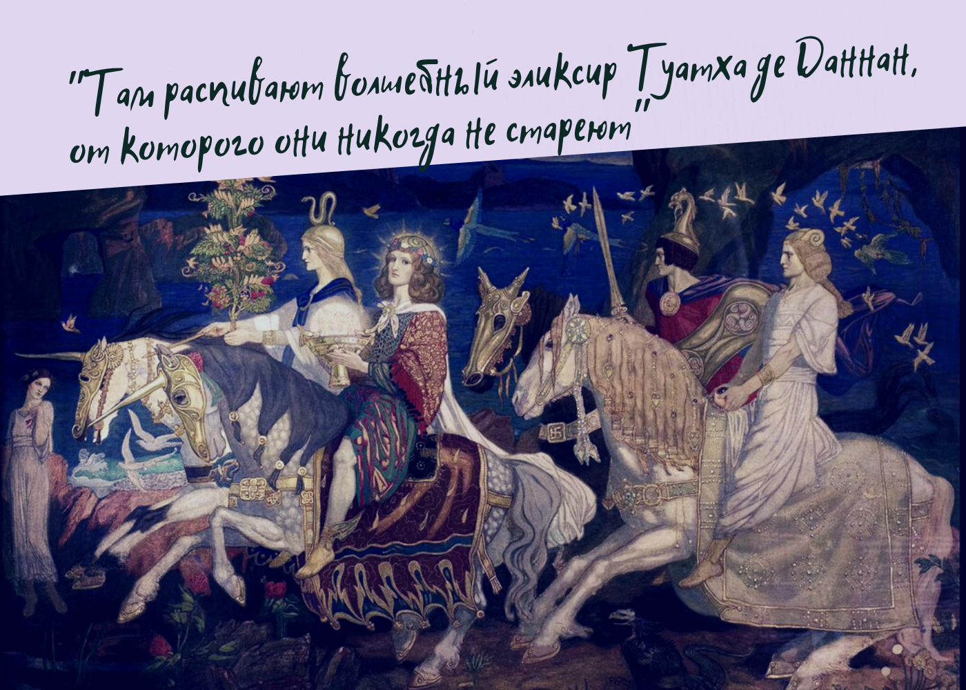 Не даром же говорят, что проиграв в битве за Ирландию сыновьям Миля, племена богини Дану "скрылись под покровом невидимости и там, где человеческий глаз видит лишь зелёные холмы, под покровом возвышаются роскошные замки и цветут сады, там распивают волшебный эликсир Туатха де Даннан, от которого они никогда не стареют".