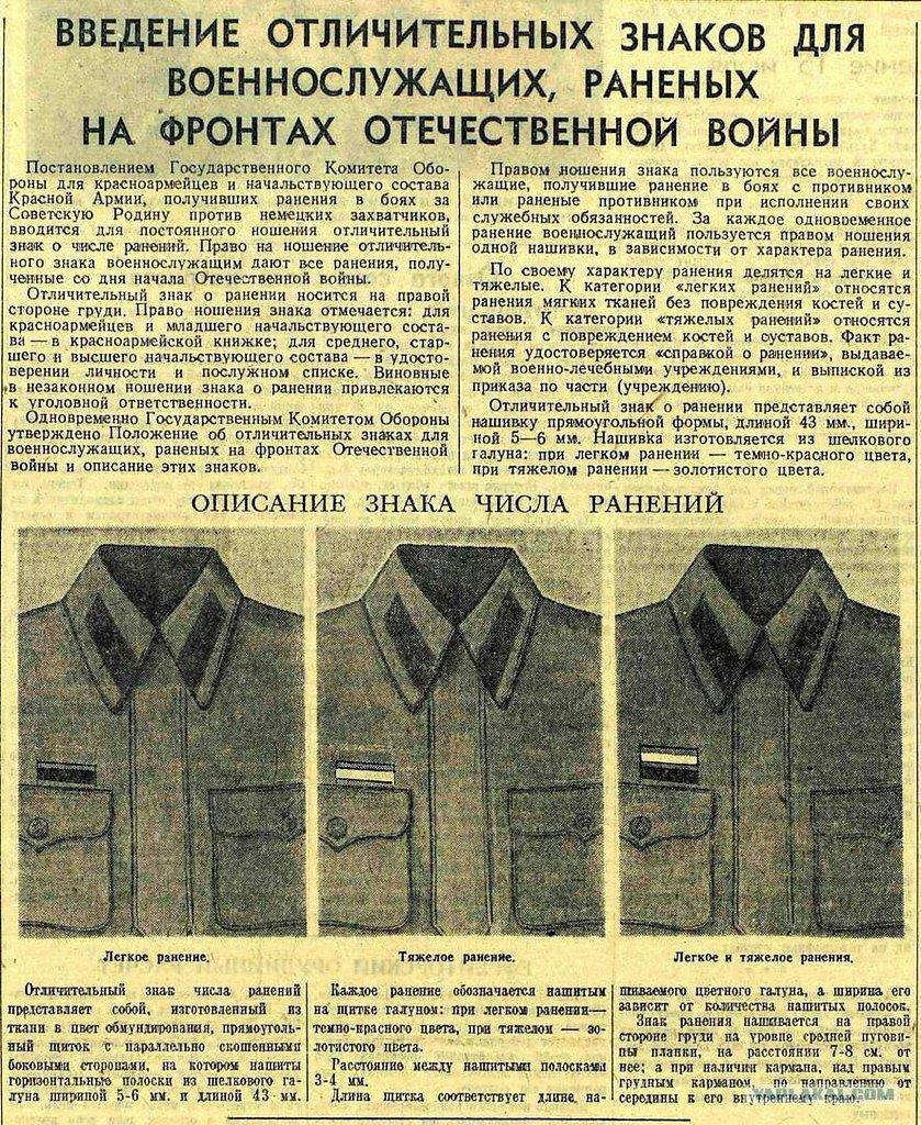 2. Утвердить «Положение об отличительных знаках для раненых военнослужащих Красной Армии на фронтах отечественной войны» и прилагаемые к нему образцы знаков. 3. Отличительный знак о ранении носить на правой стороне груди.