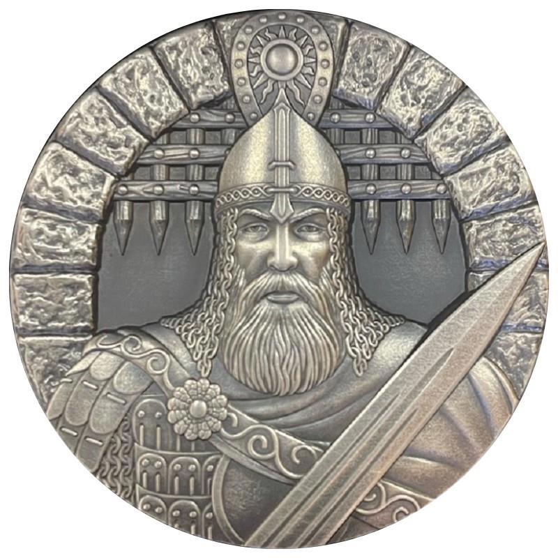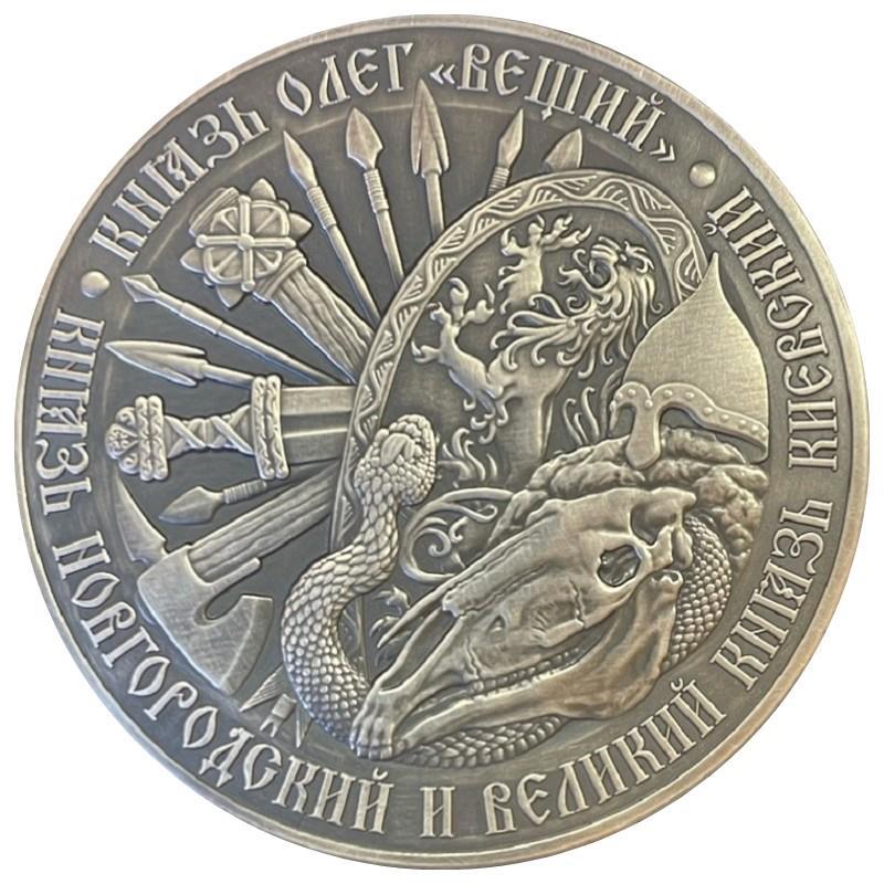 Серебряный раунд Вещий Олег, 2 унции, тираж 100 штук, проба 9999, стиль антик финиш.