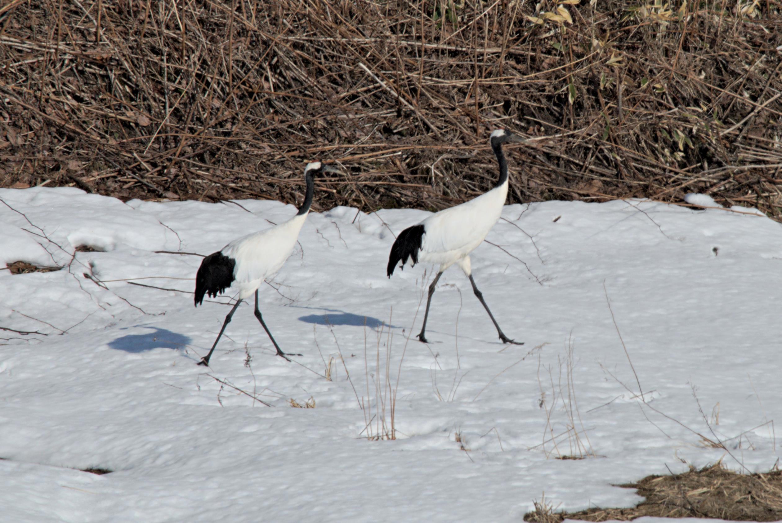 Японский журавль, лебедь-кликун (в центре) и два малых/тундровых лебедя. Рядом были еще один журавль и кликун, но в кадр не влезли.