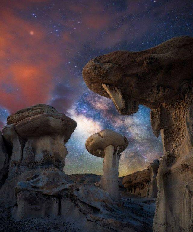 Млечный Путь над инопланетным ландшафтом пустыни в Нью-Мексико.