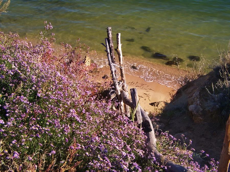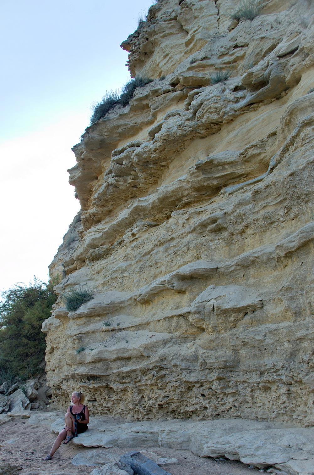 Здесь видна высота (специально села, а то обычно не видно, что стена высокая). Где-то берег пониже, а где-то еще выше, так что без лестниц или крутых тропинок, протоптанных в глинистых ущельях, спуститься не получится.