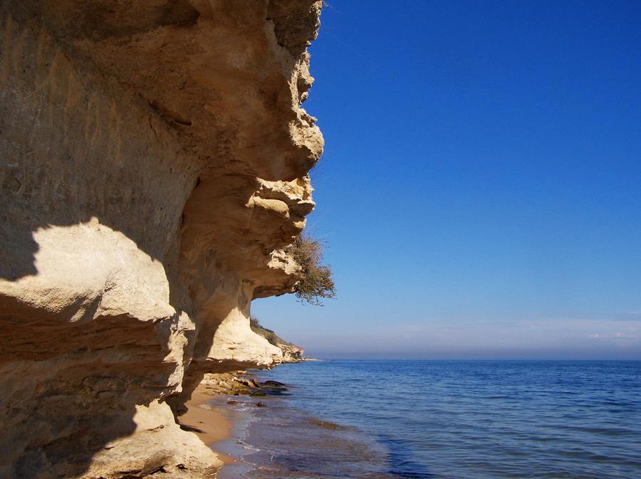 Обрывы Павловского мыса сложены из ракушечника, и прихотливо выветриваются, создавая сказочные, но местами опасные ландшафты, и лучше под этими козырьками не гулять...