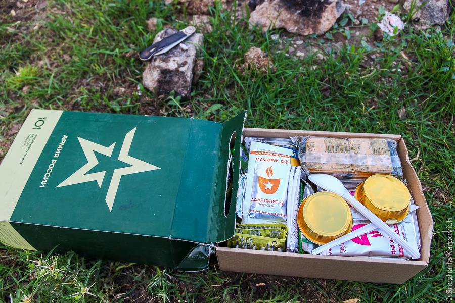 Две банки каши с типа мясом. Каша, чаще всего, перловая. Банка тушняка, наверное, что вполне себе тушняка как по нынешним ТУ. Чай в пакетах, маленькими гранулами, сахар. И пакет сухарей, ржаных или ржано-пшеничных. Сухарями можно забить гвозди, а когда размачиваешь их в чае, то наружу порой выплывали розовые милые червяки. Способ употребления сухпая был простой: один котелок под воду на чай, второй - для двух банок ккаши и одной тушенки, идеально на трех человек. В результате получалось варево, смахивающее на жём, что дед варил свиньям. На вкус - почему-то чуть сладковатая замазка. Но жрать можно. Всю службу с этими самими картонными коробками. У армейцев уже тогда был зеленый пластик и несколько иное содержимое. С спиртовой горелкой и галетами.