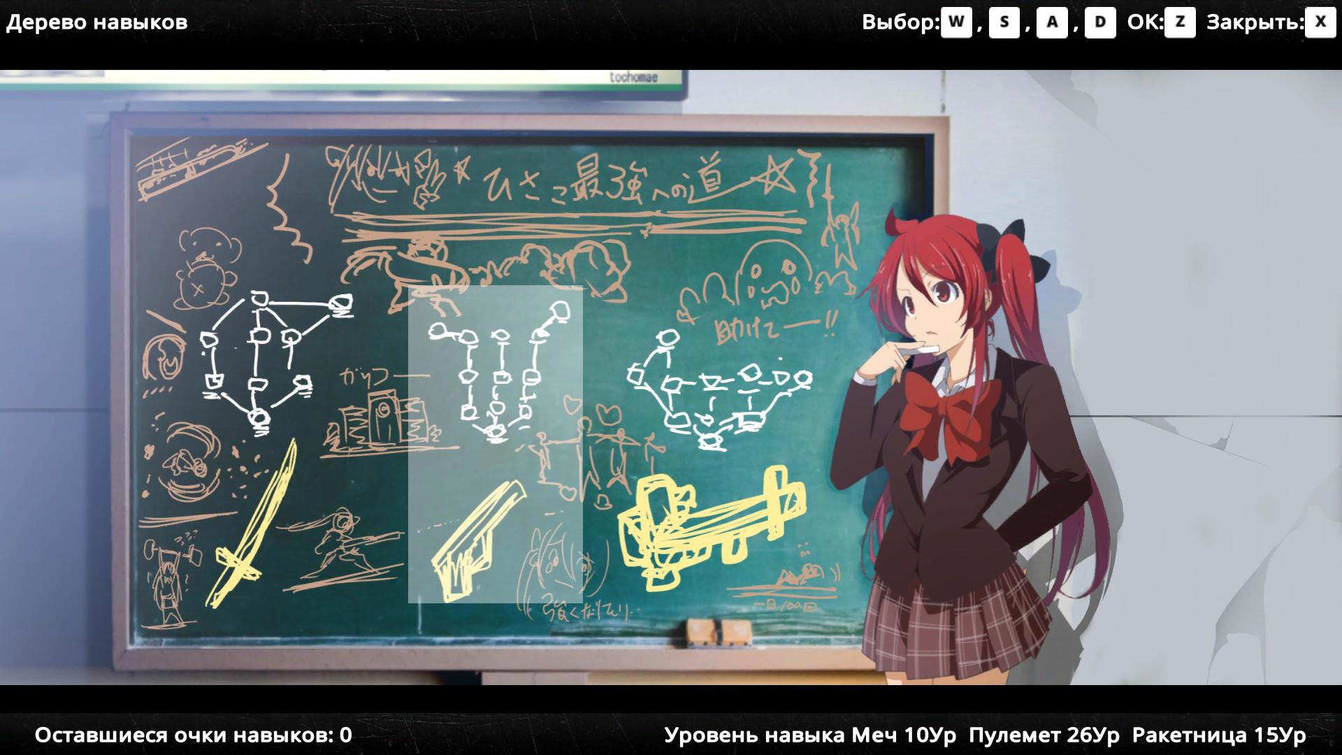 Хисако набирает левела, за которые получает скиллпоинты. Последние можно влить в одну из трех веток развития: «меч», «пулемет» и «ракетница». Качать хотя бы частично рекомендуется все, однако имеет смысл делать упор на том, что нравится больше. Лично я максил огнестрел, но ничего никому не навязываю.