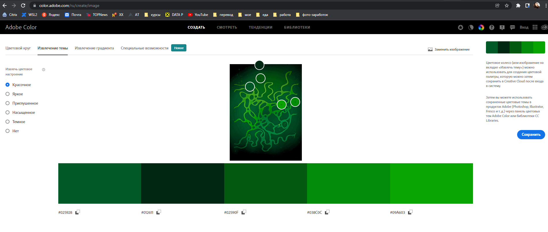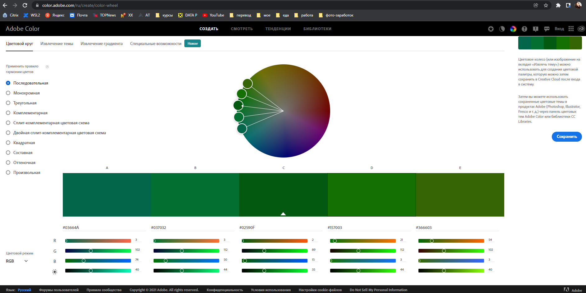 Потом если перейти на вкладку цветовой круг, то можно подобрать еще похожие цвета