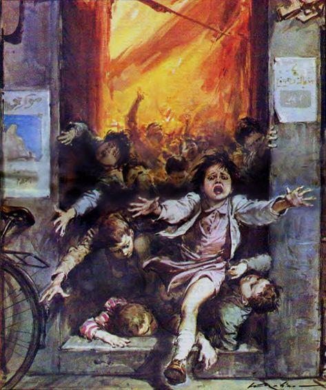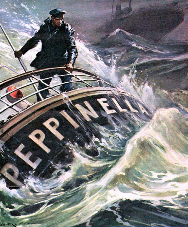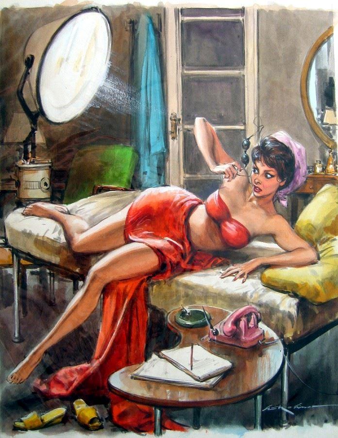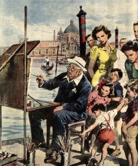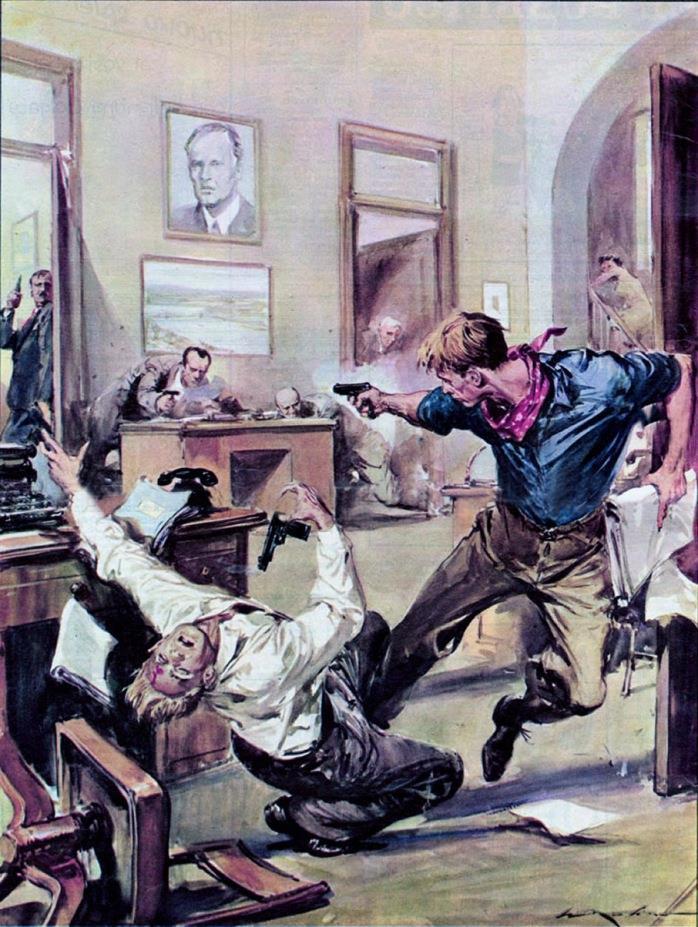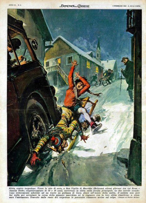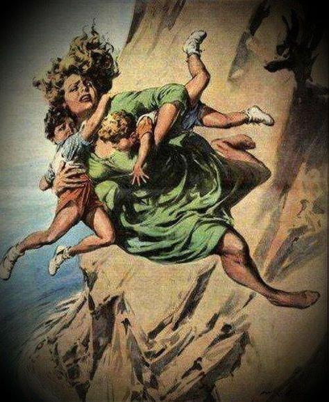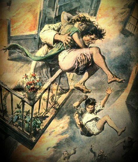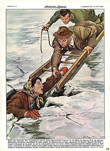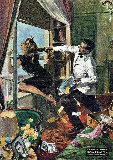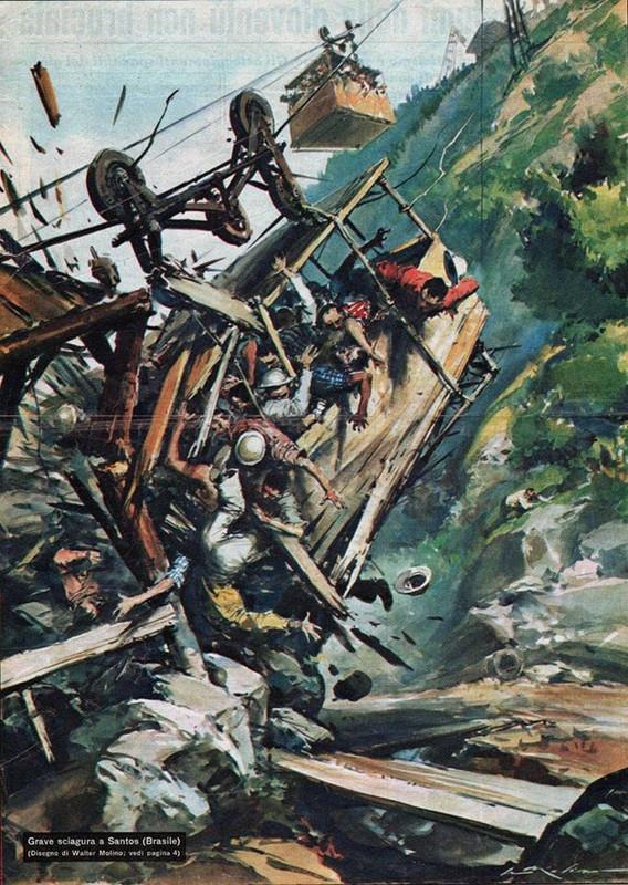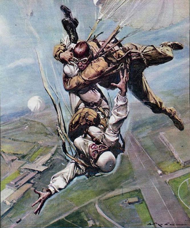 Надо добавить, что в отличие от Маттеньи, который был очень дотошен в деталях - Молино делал ставку на выразительность рисунка, а не на реализм. В частности эта картинка была раскритикована - и дверь не в ту сторону у самолета открывается, и мужику бы руку отрубили захлопнувшейся от напора воздуха дверью и с девицы потоком сорвало бы не только туфлю, а всю одежду...