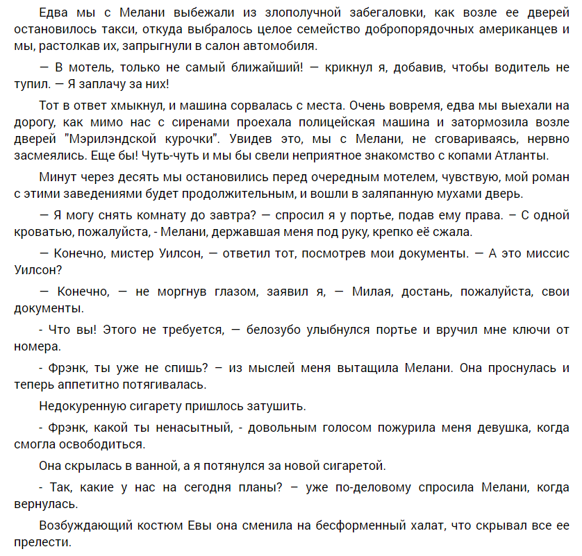 Реалии. Не знаю что у автора с Америкой, возможно это такая противоестественная любовь, но объект любви неплохо было бы знать получше. Получше не в смысле более точно знать стоимость бургера и колы, а более точно представлять себе отношение людей к другим людям, к деньгам, услугам, окружающему миру. Если этого нет, то и читатель в это не поверит и сам перемажешься. Разбирать заклепки нет никакого желания, просто потому что разбор будет в три раза больше по тексту, чем пациент.