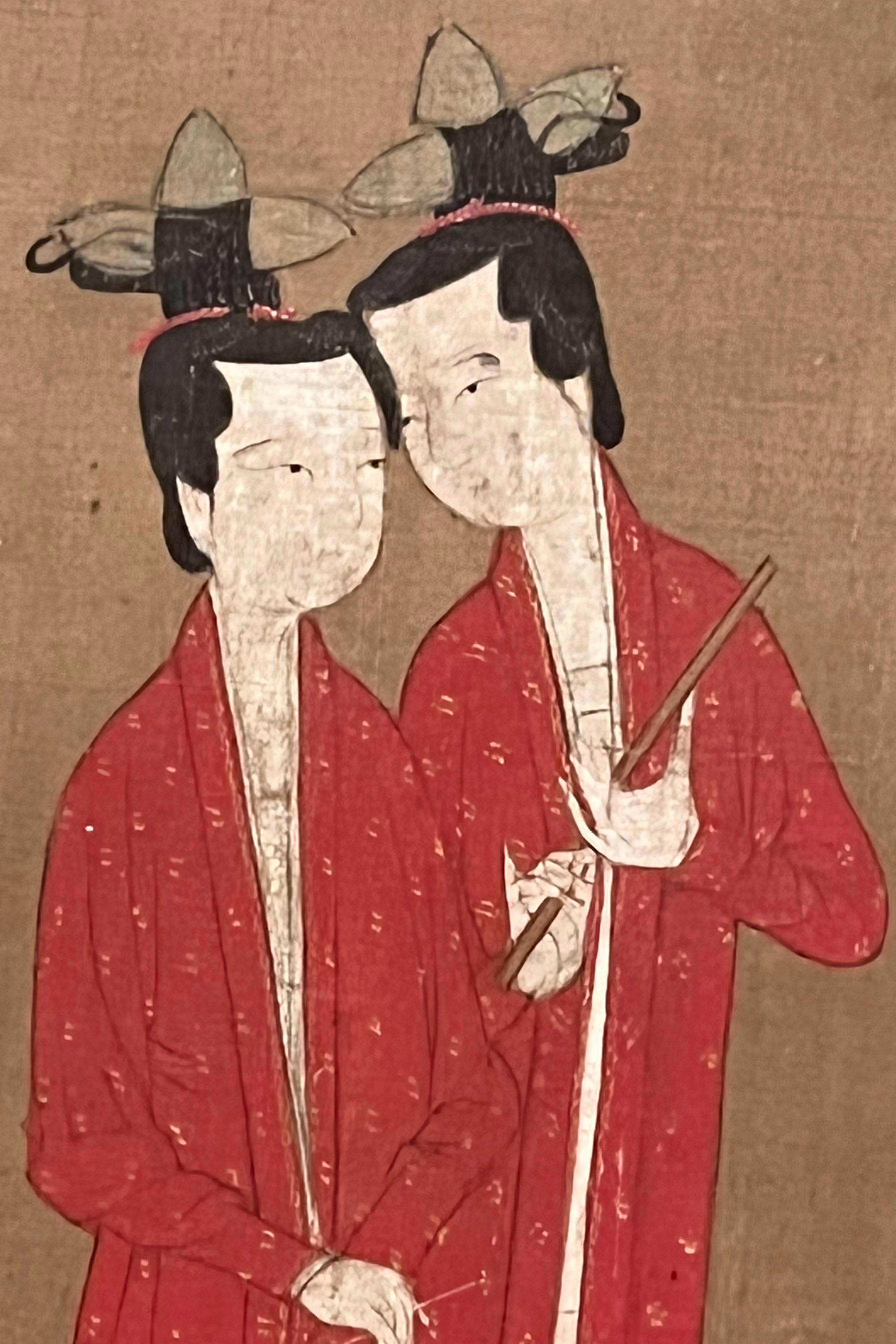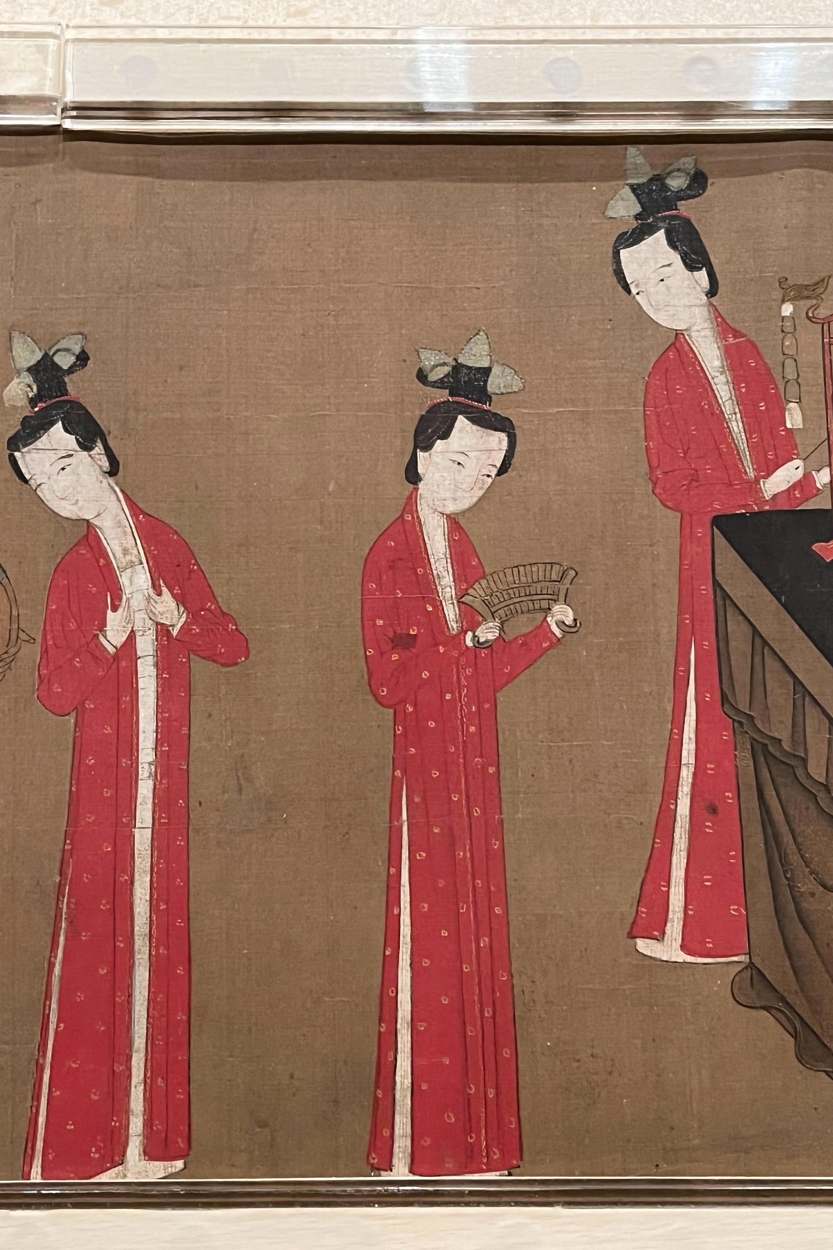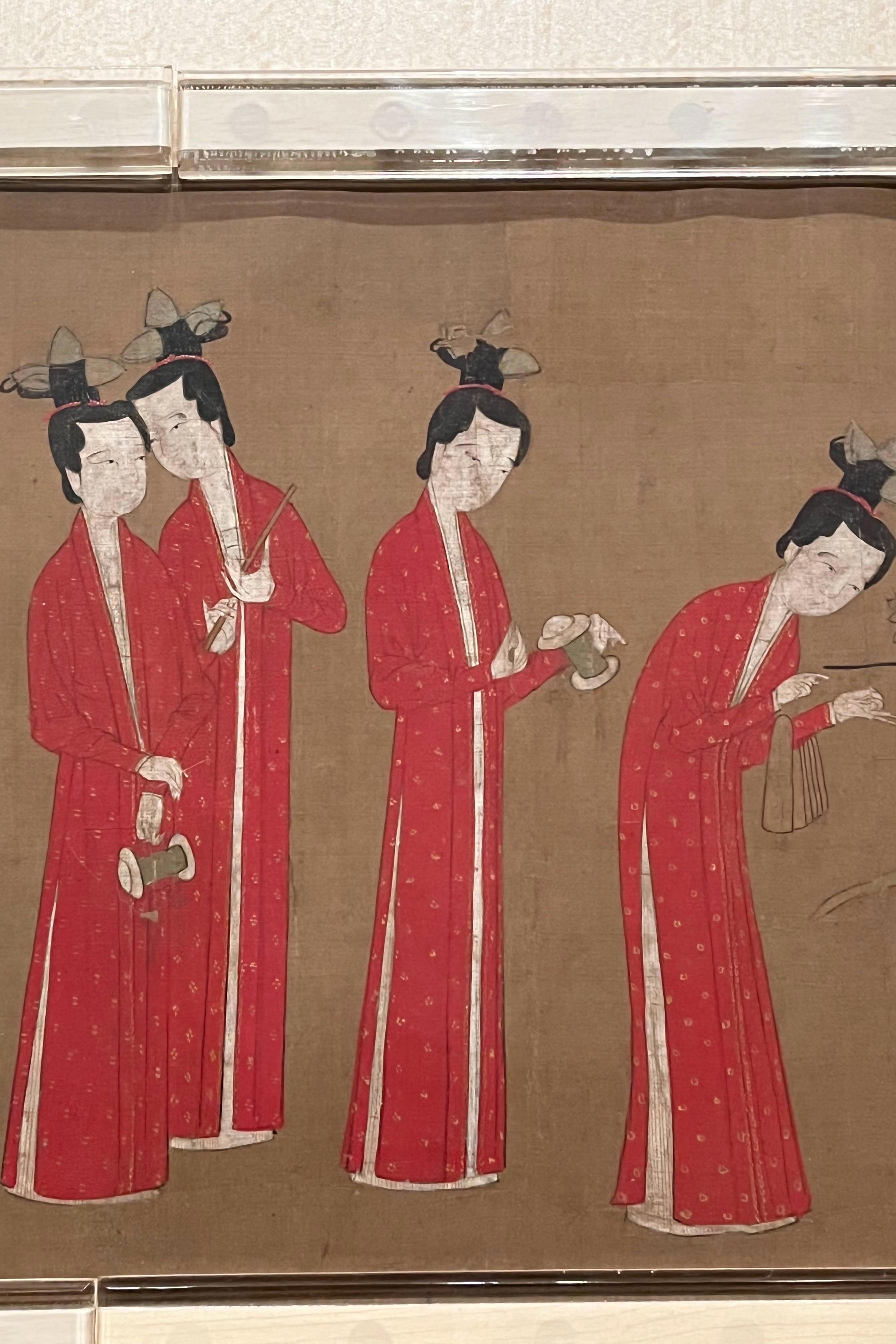 Мы видим девять придворных девушек-музыкантов, готовящихся к выступлению. Они все одеты в длинные красные бэйцзы (褙子) с узкими рукавами и боковыми разрезами, демонстрируя классический образ женщины своей эпохи.