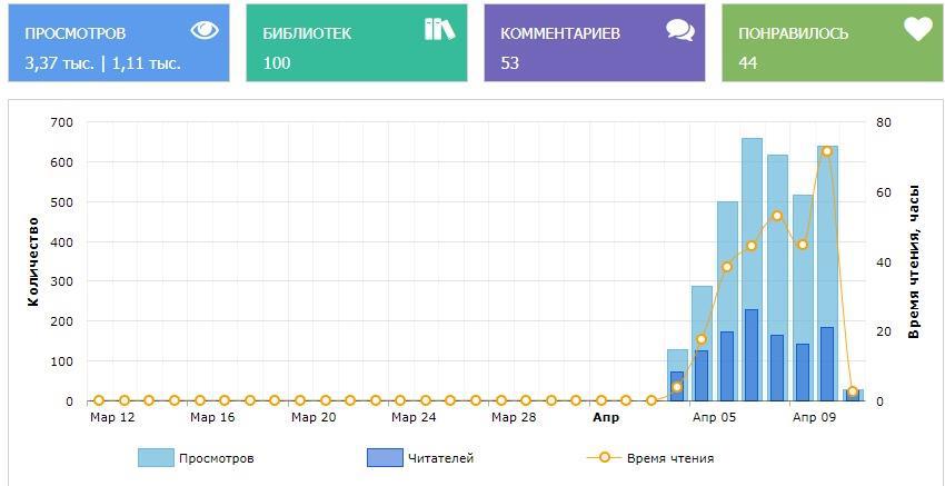 Так же я планировал сначала примелькаться, публикуя по 2 главы в день при выкладке первой книги, чтобы затем выкладывать вторую. Однако установил правило: комментарии, лайки и библиотеки делают меня счастливым настолько, что я радостно выкладываю следующую главу при достижении значимых показателей раньше планируемого времени.