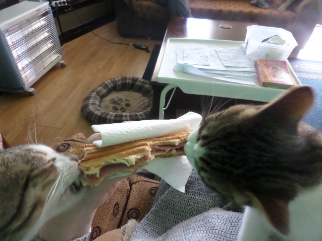 Автор: Виолетта СеферидуСяду на пенек, съем пирожок. Только сесть и получилось. Сделала себе бутерброд, дошла до диванчика, плюхнулась, настроила экран, тащу бутер в рот. Шото тяжелый какой-то. Глядь, а на нем уже висят с двух сторон двое саблезубых проглотов. А главное, вцепились, как в свой родной. И когда окружить успели, неслышно так. Пытаюсь стряхнуть, не получается. Пришлось быстро кусать, наперегонки, кто сколько успеет.