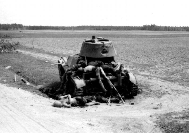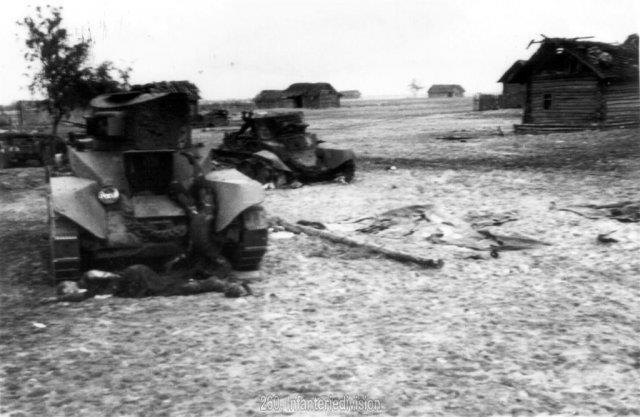 Подбитые советские танки, тот что слева - часто встречается на фото - и похоже, что танкистов немцы жгли специально - так как сам танк не горел. Мне попадались фото как раз оттуда и того же автора - но из санчасти немцев - отмечалось очень много раненых поступило, так что видать наши наломали фрицам дров и за это их сожгли.