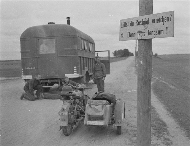 "Хочешь добраться до Рославля? Едь медленно!" - проблема с лихачами и нарушителями ПДД в вермахте стояло весьма остро. Как вырвались из-под присмотра немецкой полиции - так и понеслось, а фельджандармы не поспевали везде. Да и поди пойми - из-за чего авария произошла - из-за того, что надо было уходить от обстрела партизан или просто устроили гонки на грузовиках.