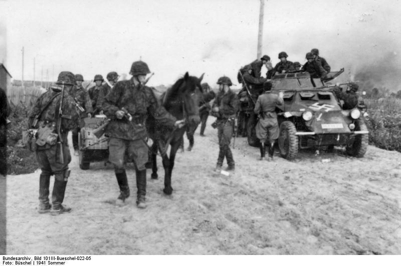 Кавалерийская бригада СС на марше. Россия, а ПП итальянский у того, что слева. (Но может быть и финский). Свастика на капоте броневика - для авиации. На немцах тот самый камуфляж из-за которого их звали "древесные лягушки".