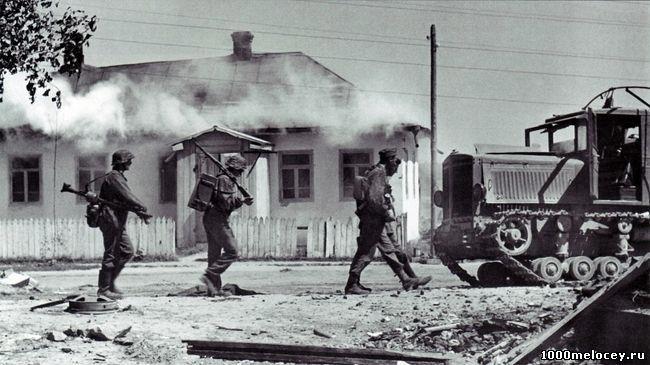 Мимо горящего дома и разбитого тягача "Коминтерн" идет пулеметный расчет с МГ-34.