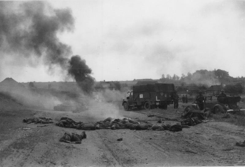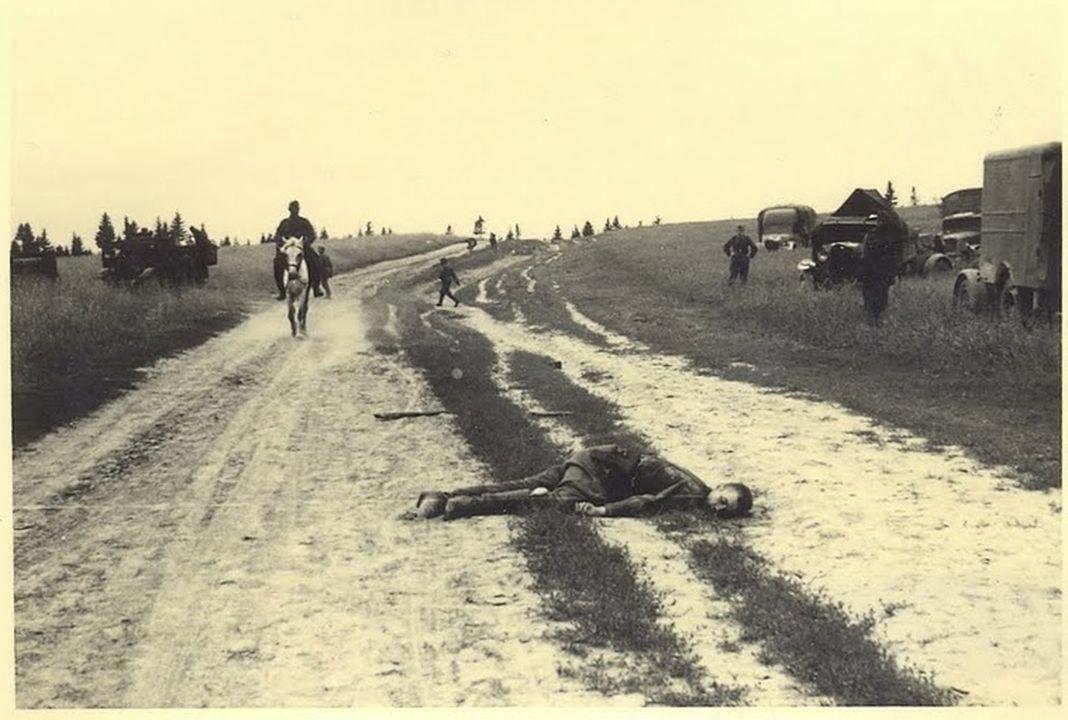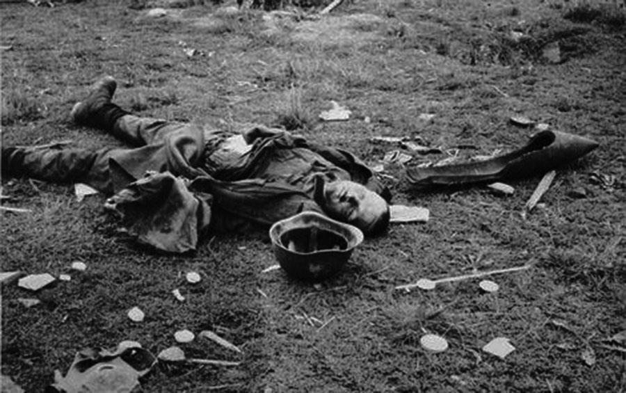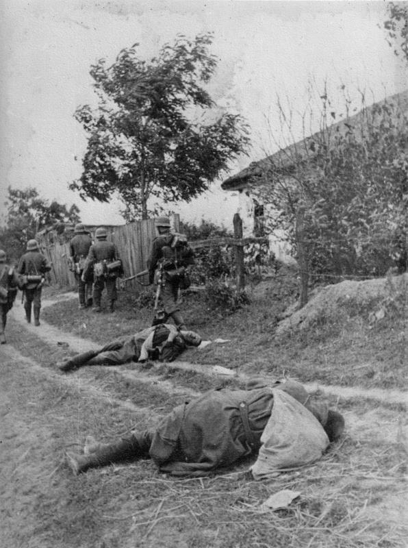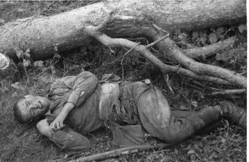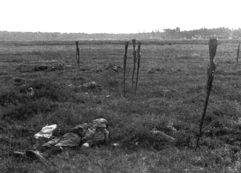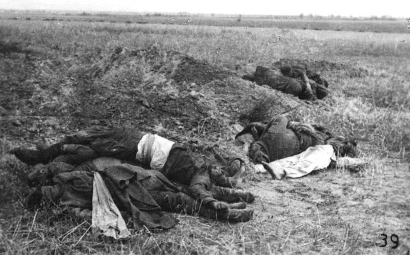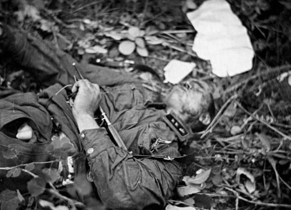 Типовой снимок зольдата победителя с трупами.