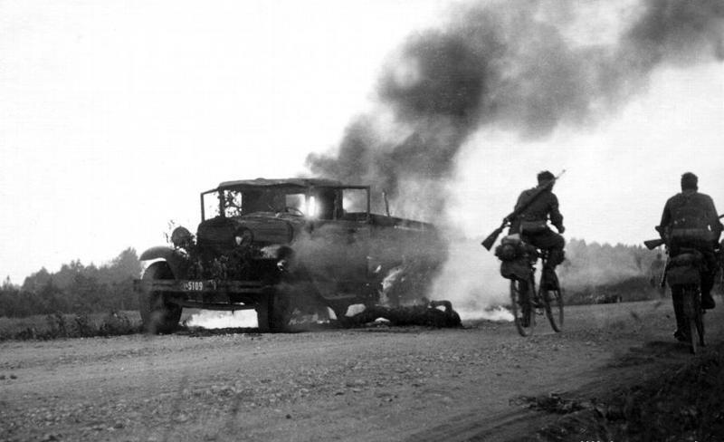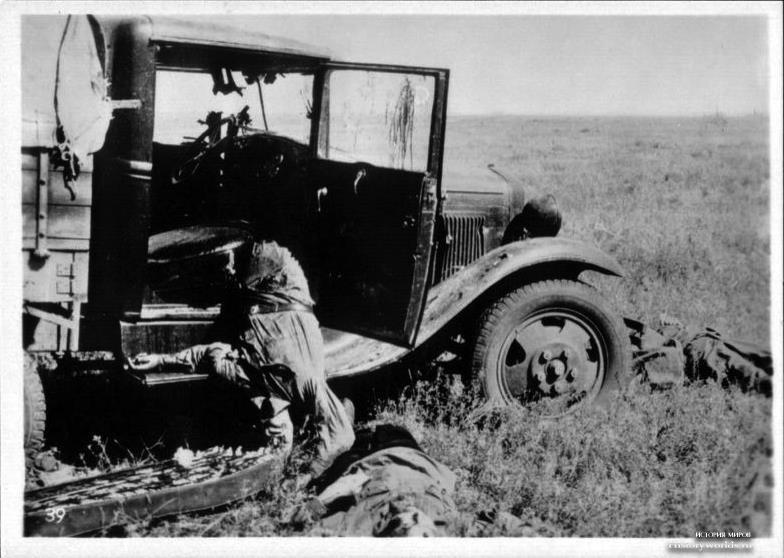 Горят полуторка и шофер.