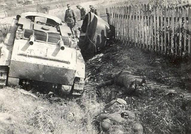 Немцы обозначили фото, как погибшие внутри танка, но сомневаюсь - ребята из пехоты и места многовато для танка, опять же техника какая-то не танковая вроде.