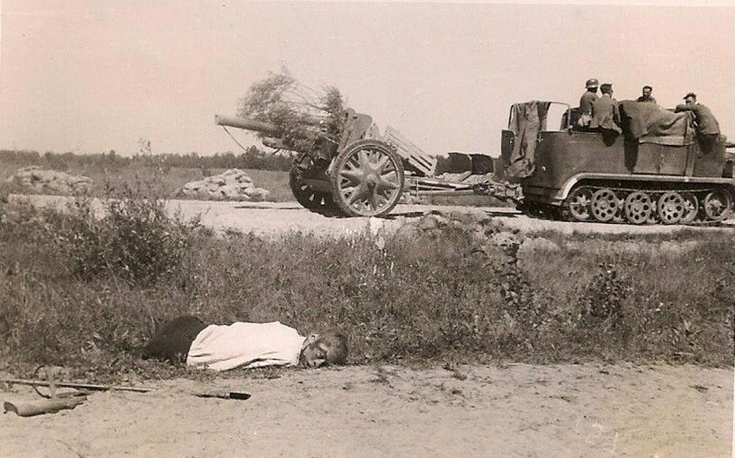 Расчет немецкой пушки проезжает мимо погибшего бойца.
