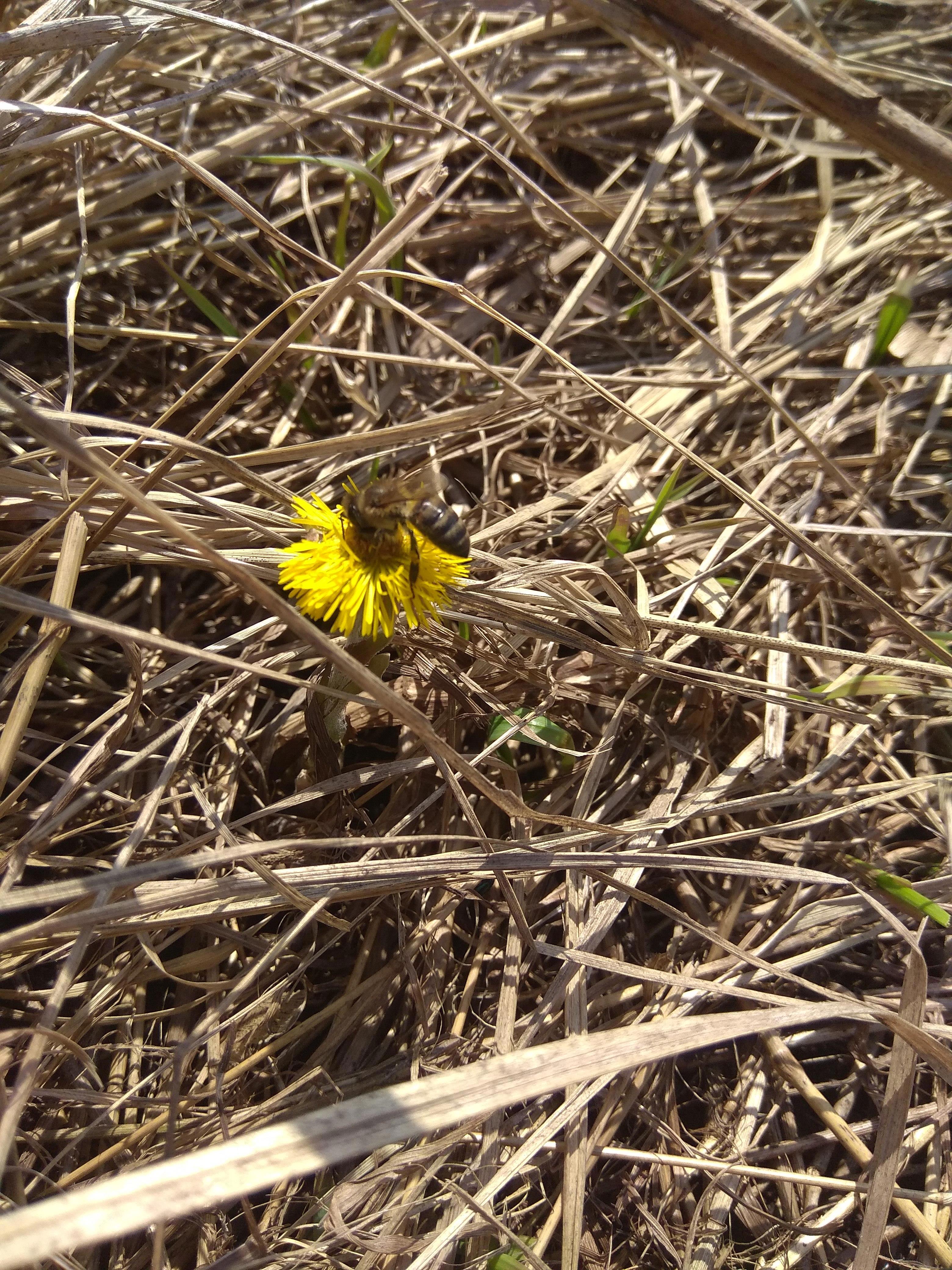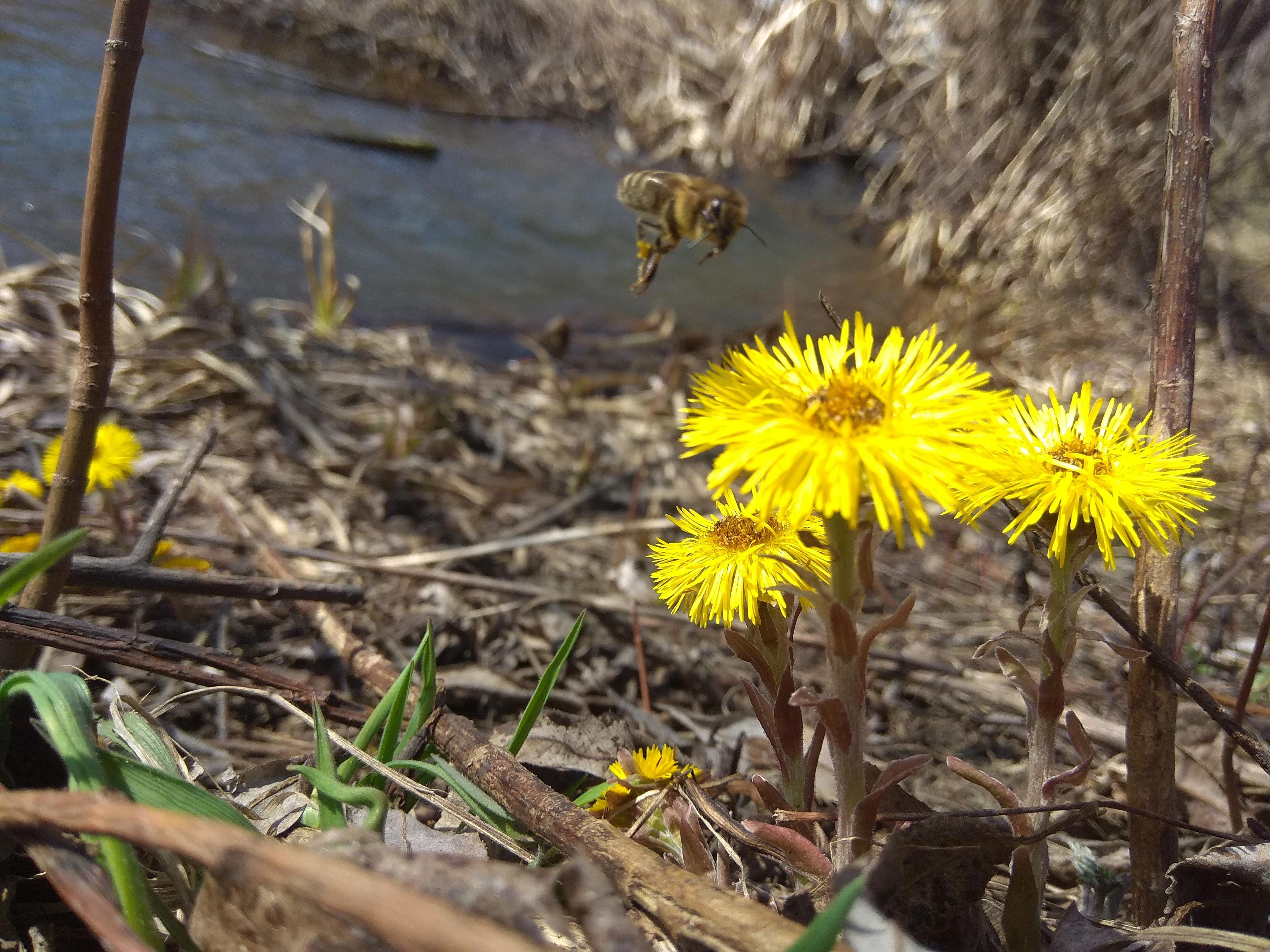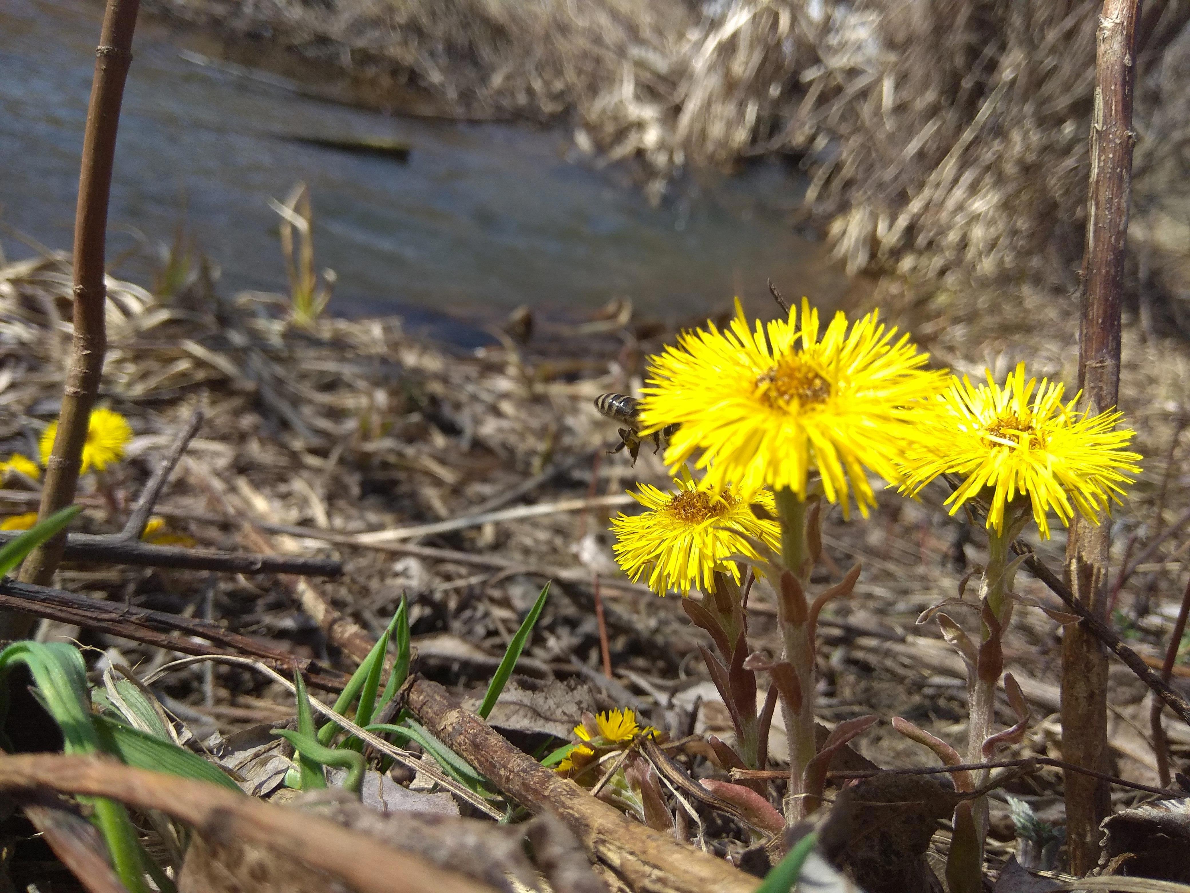 Мать-и-мачеха -- наш первоцвет. У кого-то подснежники, морозник, пролеска и так далее. Здесь же эти "одуванчики" разбавляют серые болотистые низины. На клумбах, конечно же, растут другие ранние цветы. Ну и пчелки на них трудятся...