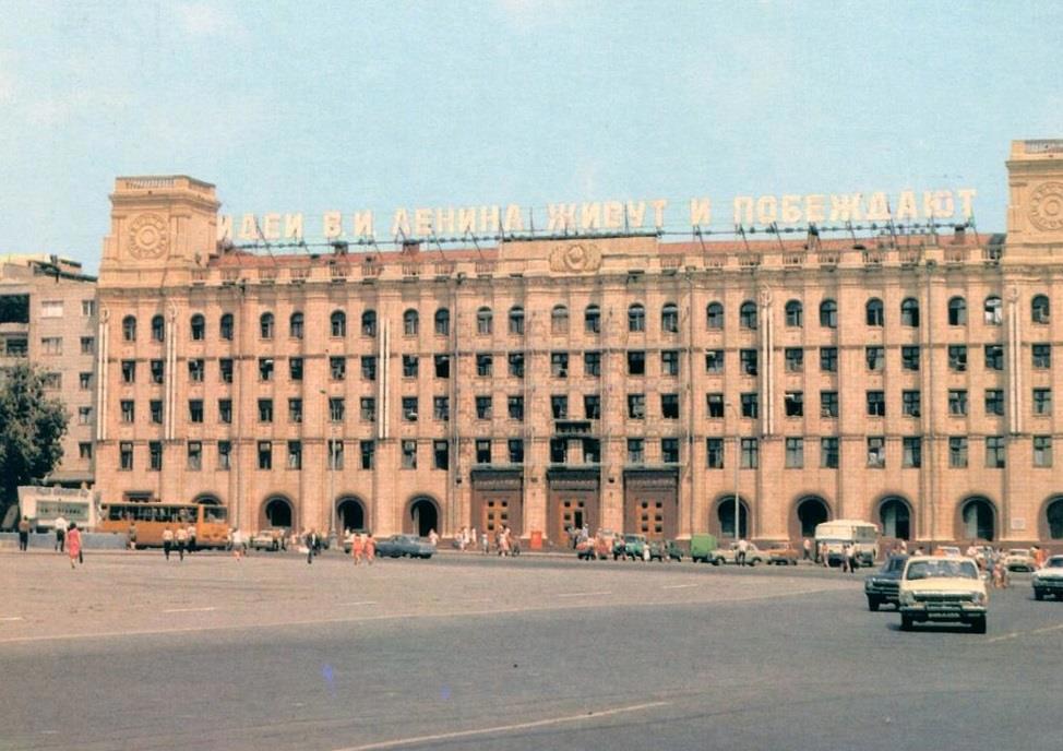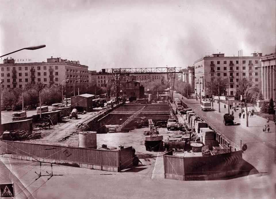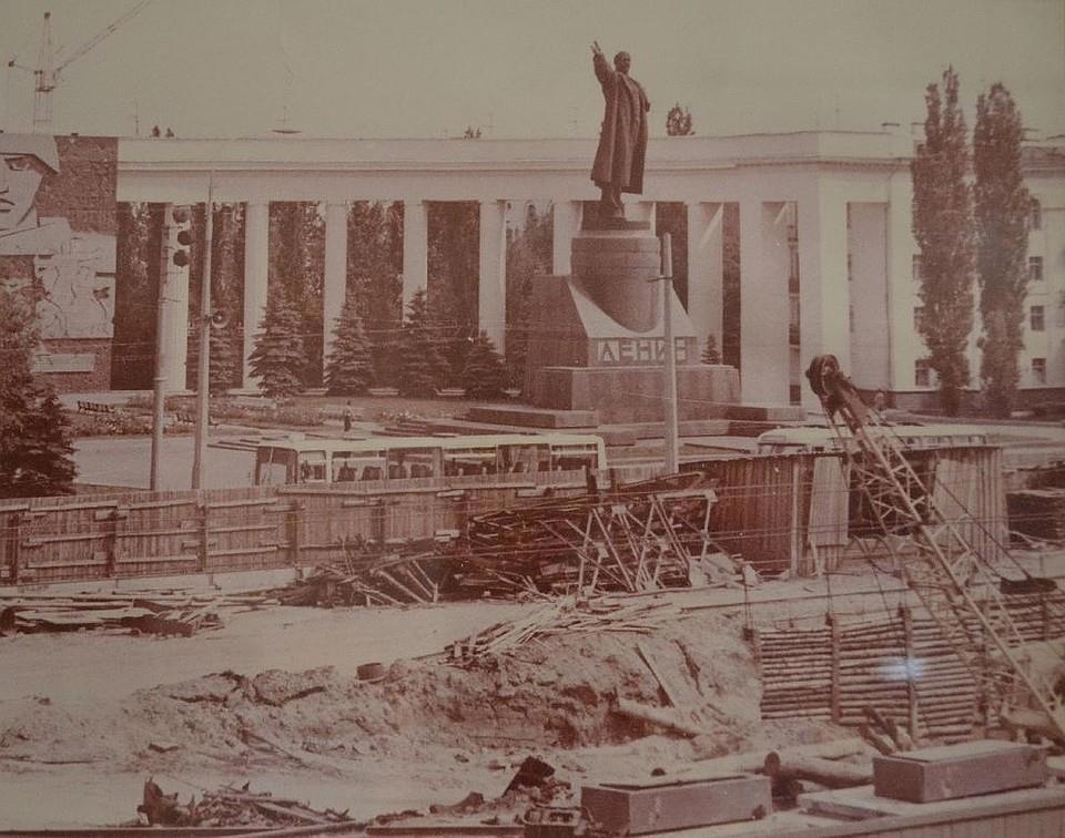 Конец семидесятых, строительство станции СТ "Площадь Ленина", справа вид сзади на "Икарус-255", стоящий возле Дома Офицеров:
