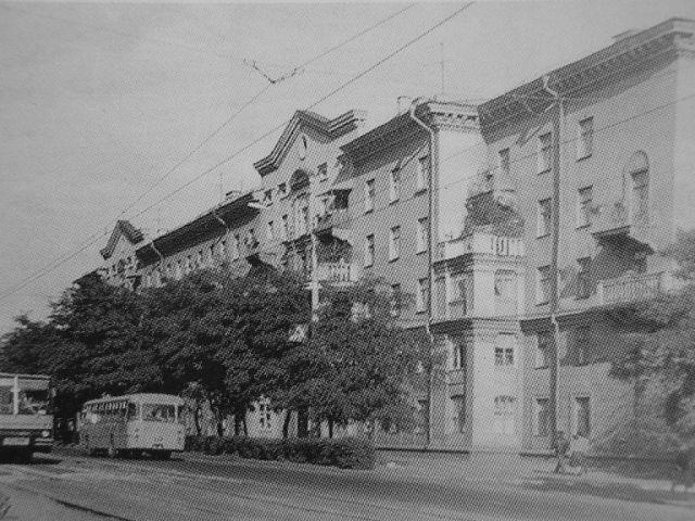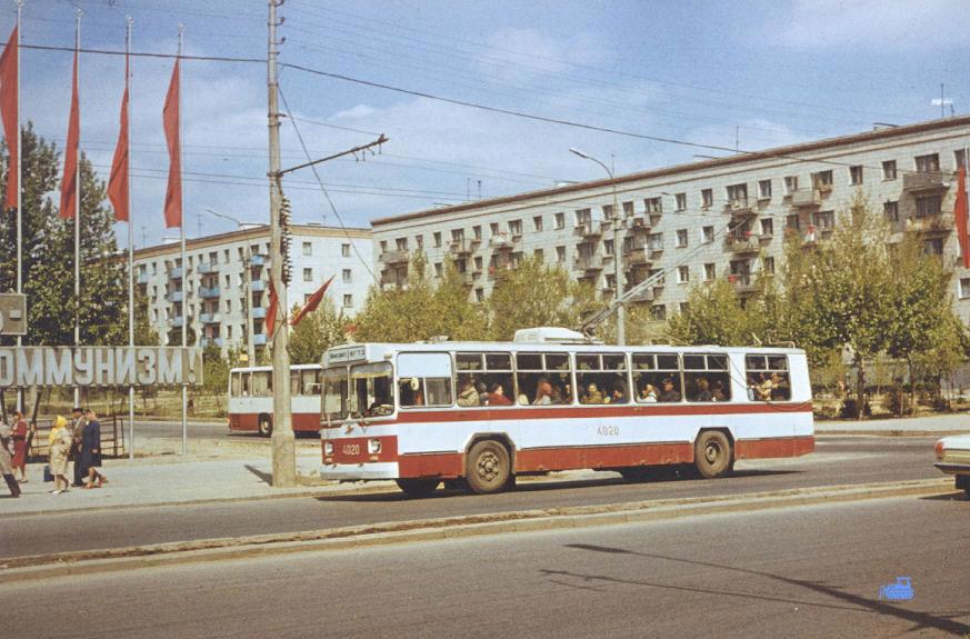 "Икарус-255" (видна задняя часть из-за троллейбуса) на перекрёстке улицы Седьмой Гвардейской с проспектом Ленина, семидесятые годы: