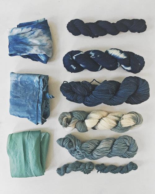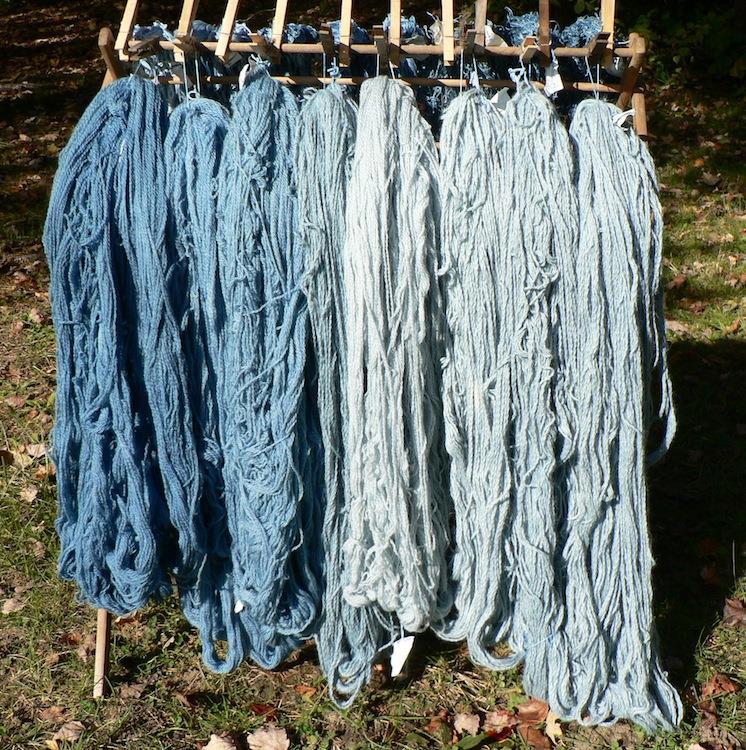 Сравнение цвета, который дает окрашивание синтетическим индиго (верхние ряды изделий) и вайдой красильной (нижний ряд):