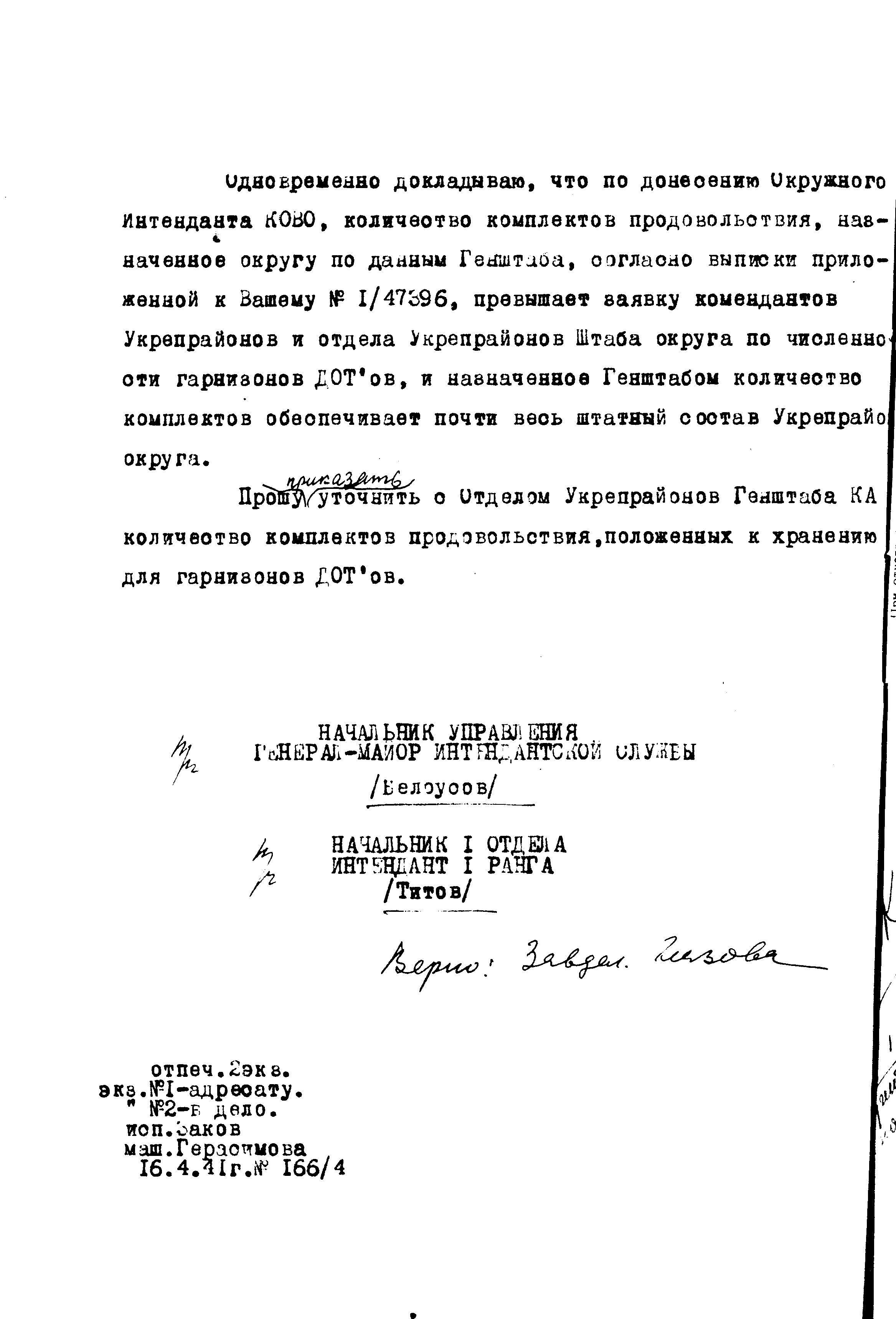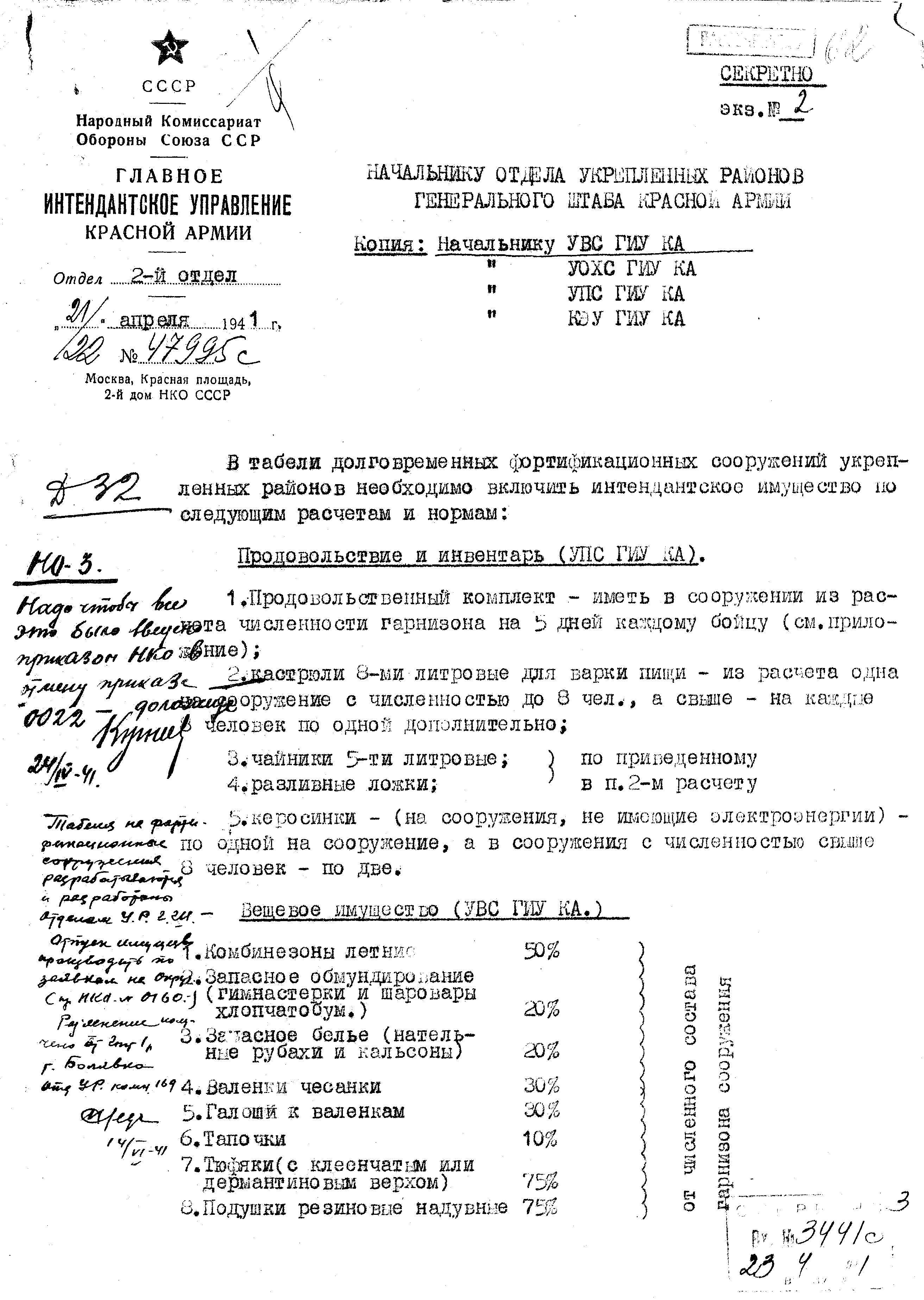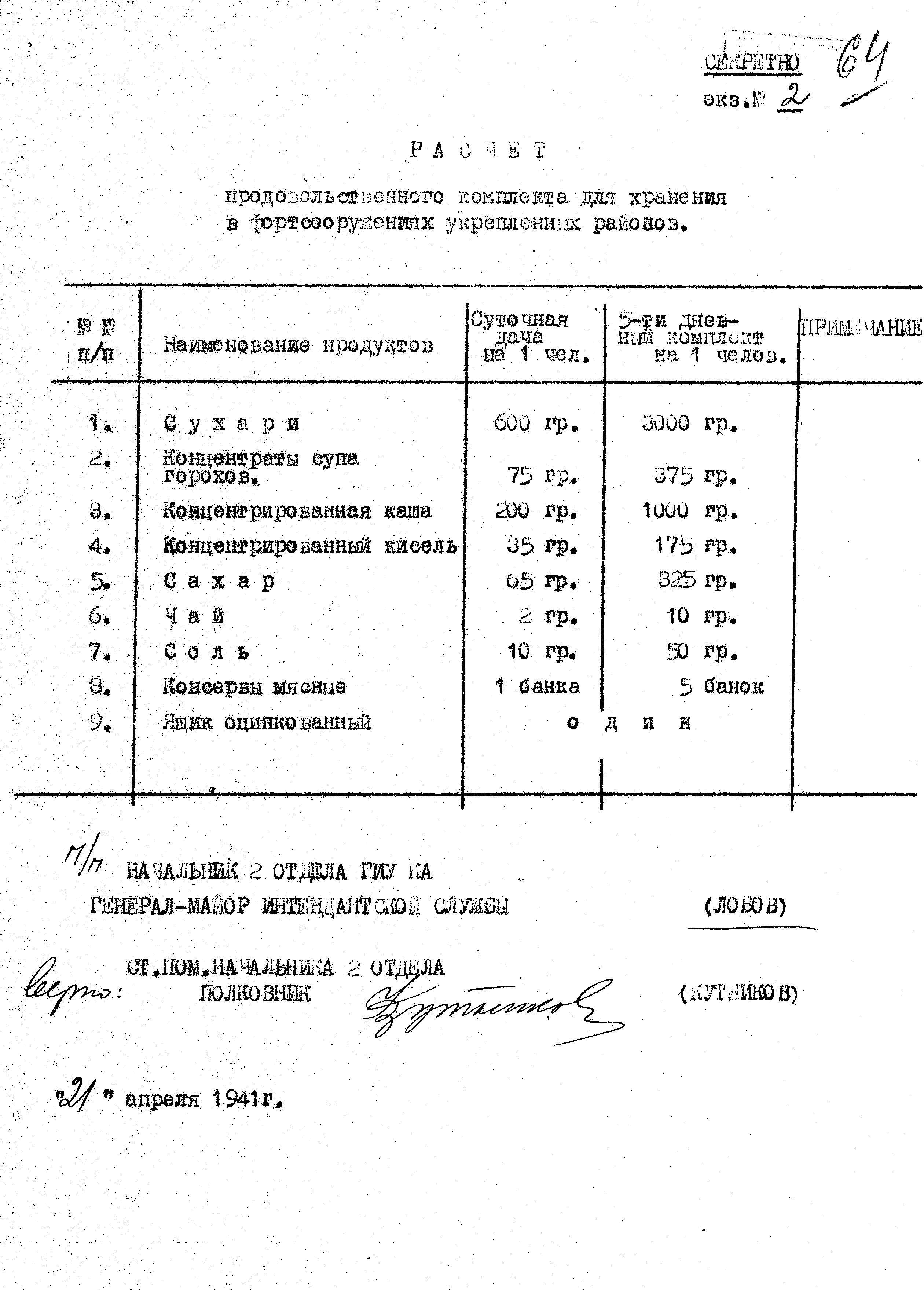 Но, не будем обсуждать все взгляды на роль УРов в отражении врага, даже те, в которых утверждается, что Красная Армия могла остановить и перемолоть врага на «линии Сталина», не допустив его в глубь страны. Предлагаю поговорить о нём, о материальном обеспечении. Ведь любой укрепрайон — это не только и даже не столько бетон, железо, дерево и прочие строительные материалы, а в первую очередь — люди. А людей необходимо кормить, водить в баню, менять им бельё, в общем решать обычные, повседневные, бытовые вопросы. Так что, предлагаю в очередной раз полистать интендантский архив, вдруг в тыловых документах удастся отыскать какие-то любопытные сведения.
