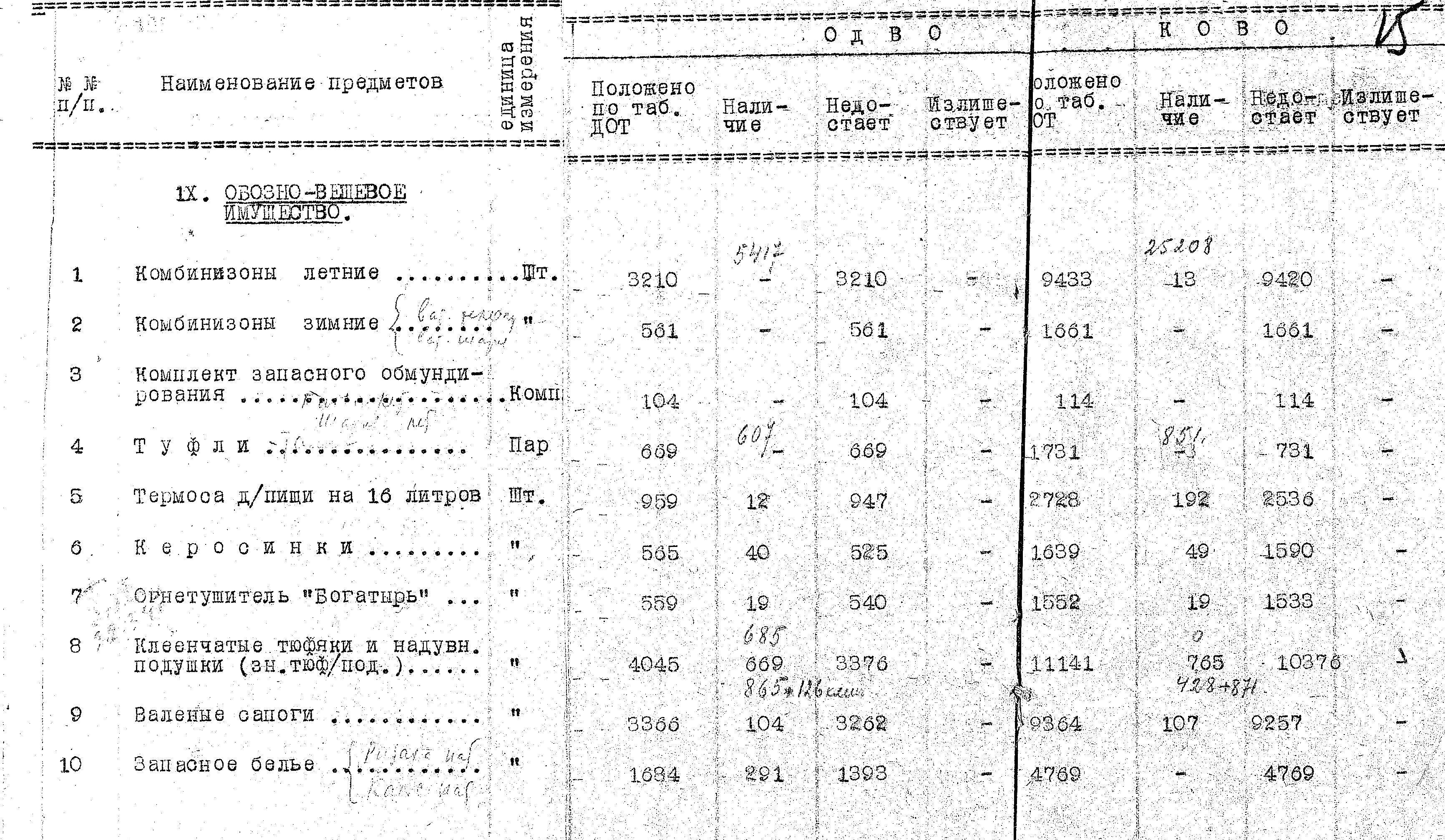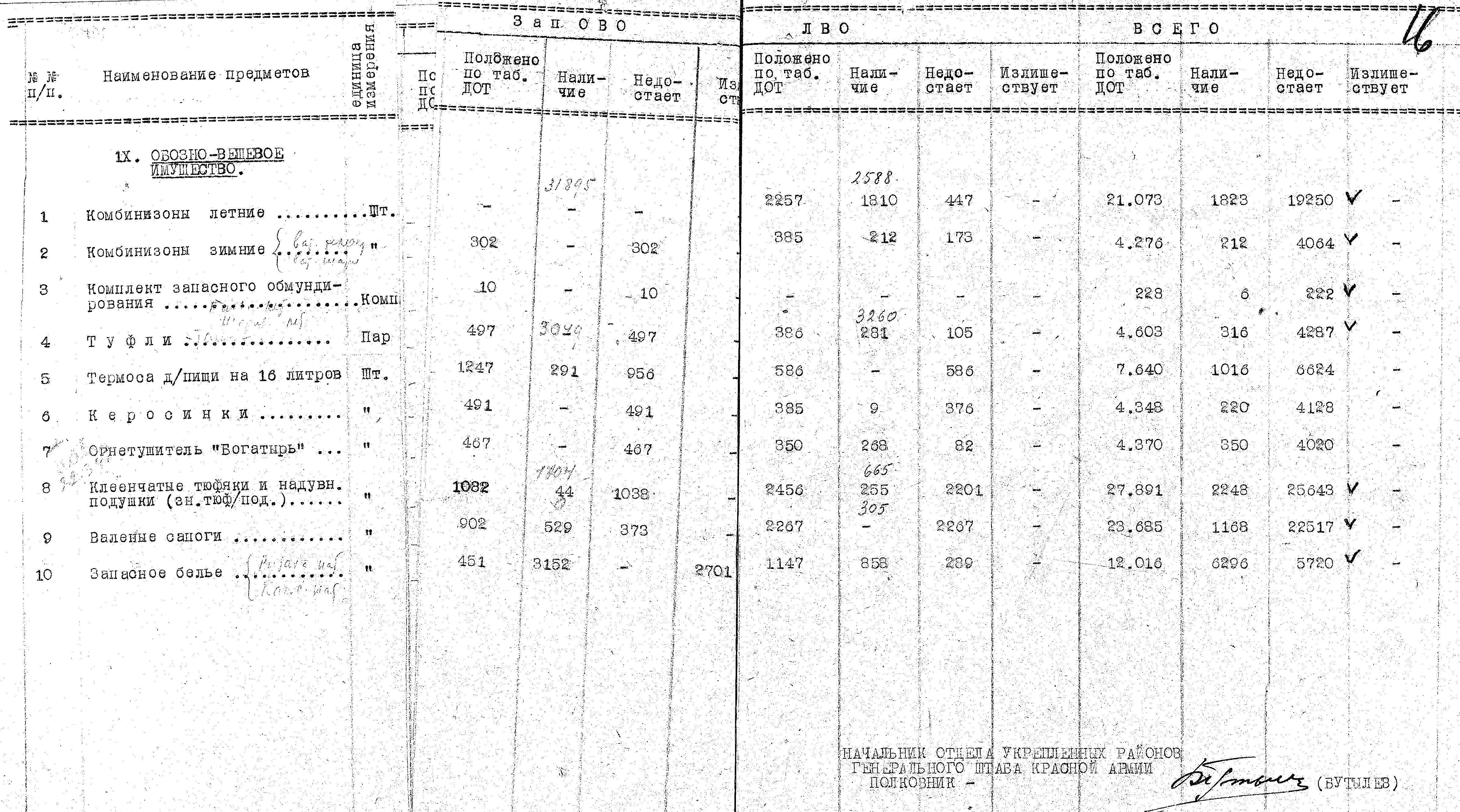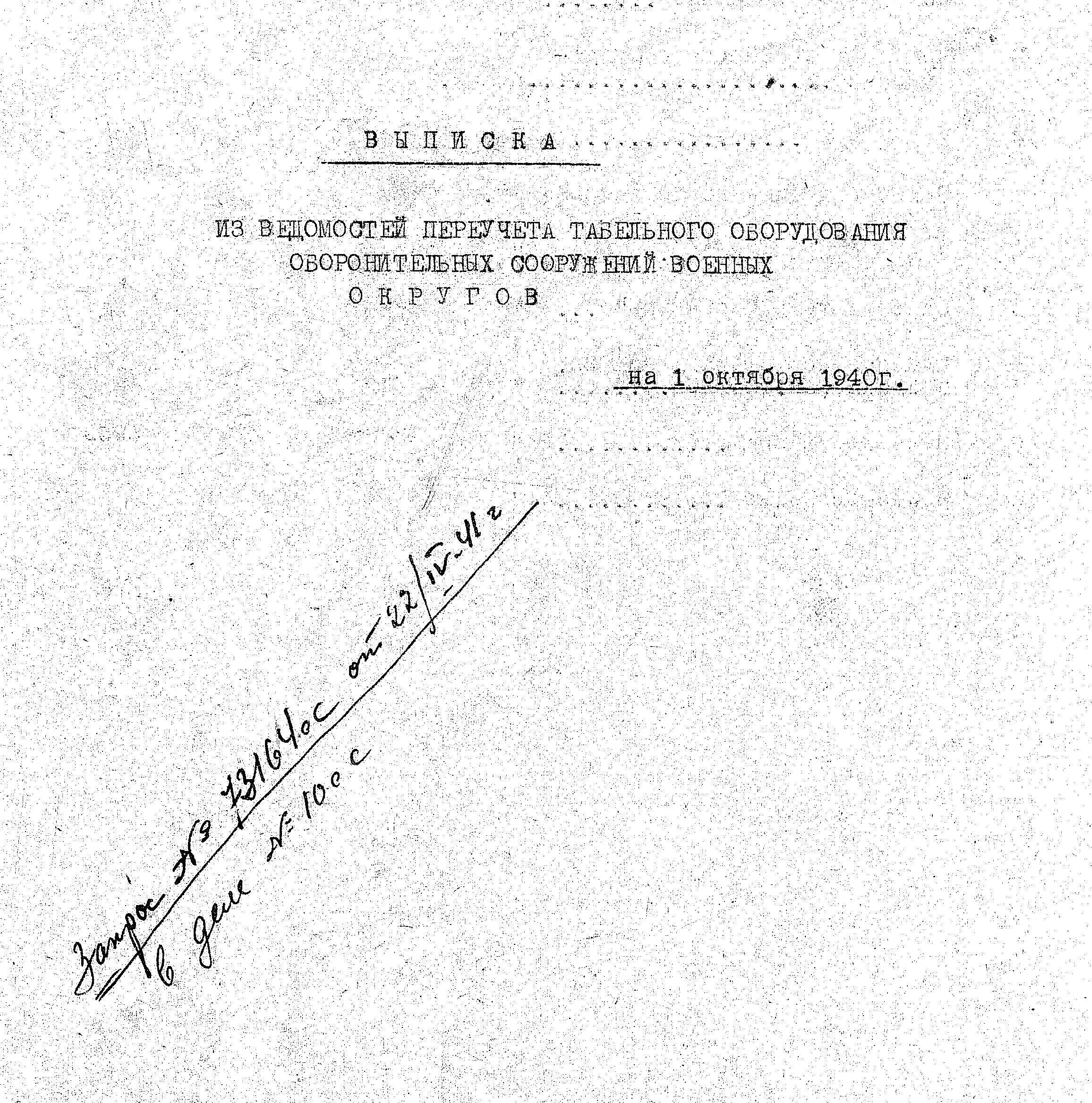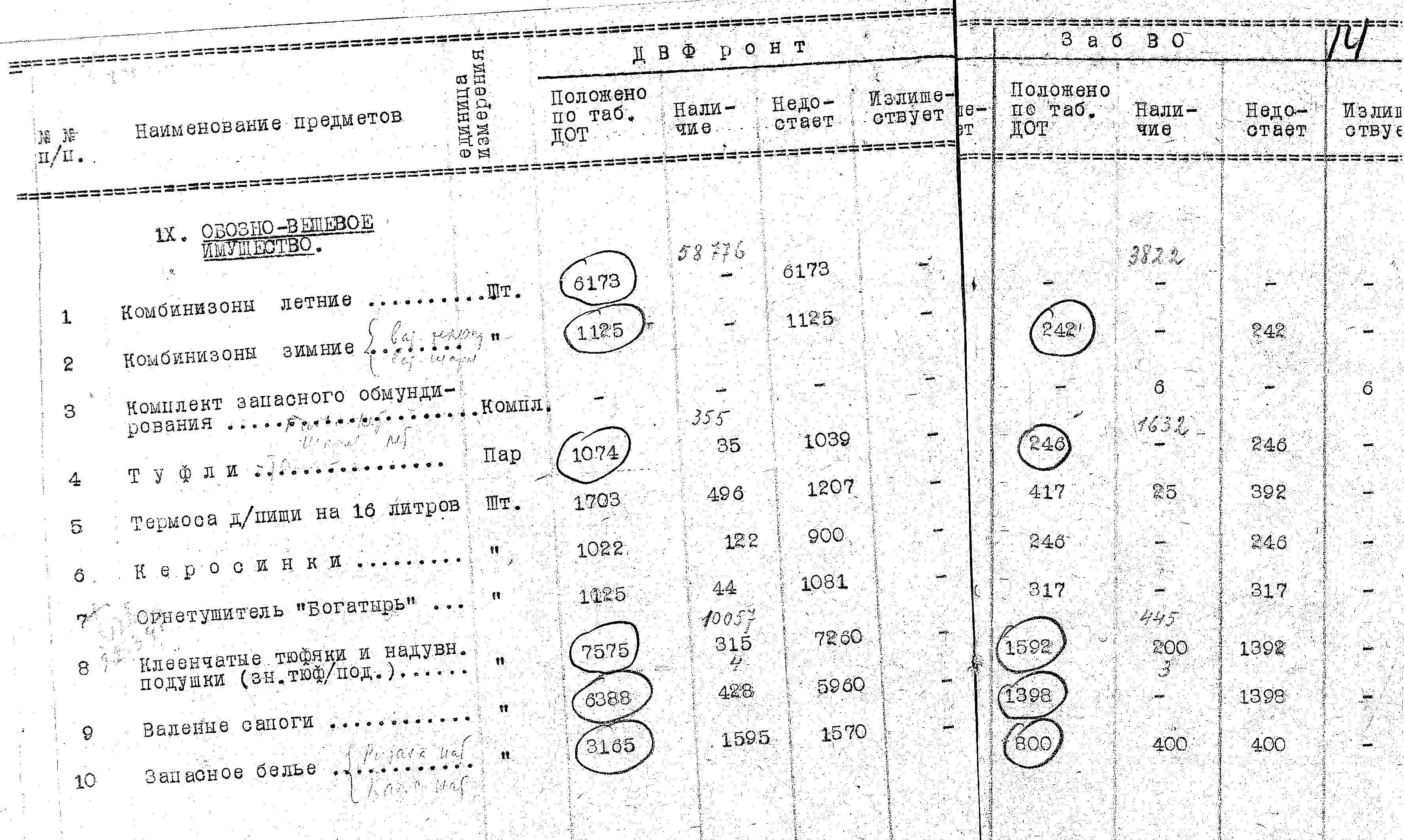 Но, чем дольше изучал ведомости, тем больше проявлялась мысль, что эту загадку мне не решить, есть в ней и другой подвох. Предлагаю вновь вернуться к выписке из ведомостей (д/с № 1). Посмотрим графу «наличие». В каждом военном округе есть записи, сделанные карандашом. Судя по тому, что этот документ был обычным, рабочим, различные пометки в нём —обыденное явление. Но вот сами цифры наличия (скорее всего это поставленное для УРов имущество) несколько удивили. Если по ДВФр, ЛенВО, ЗабВо и ОдВО поставки незначительные, то в особых Киевском и Западном это десятки тысяч. Могу только предположить, что имущество предназначалось для обеспечения «линии Молотова».