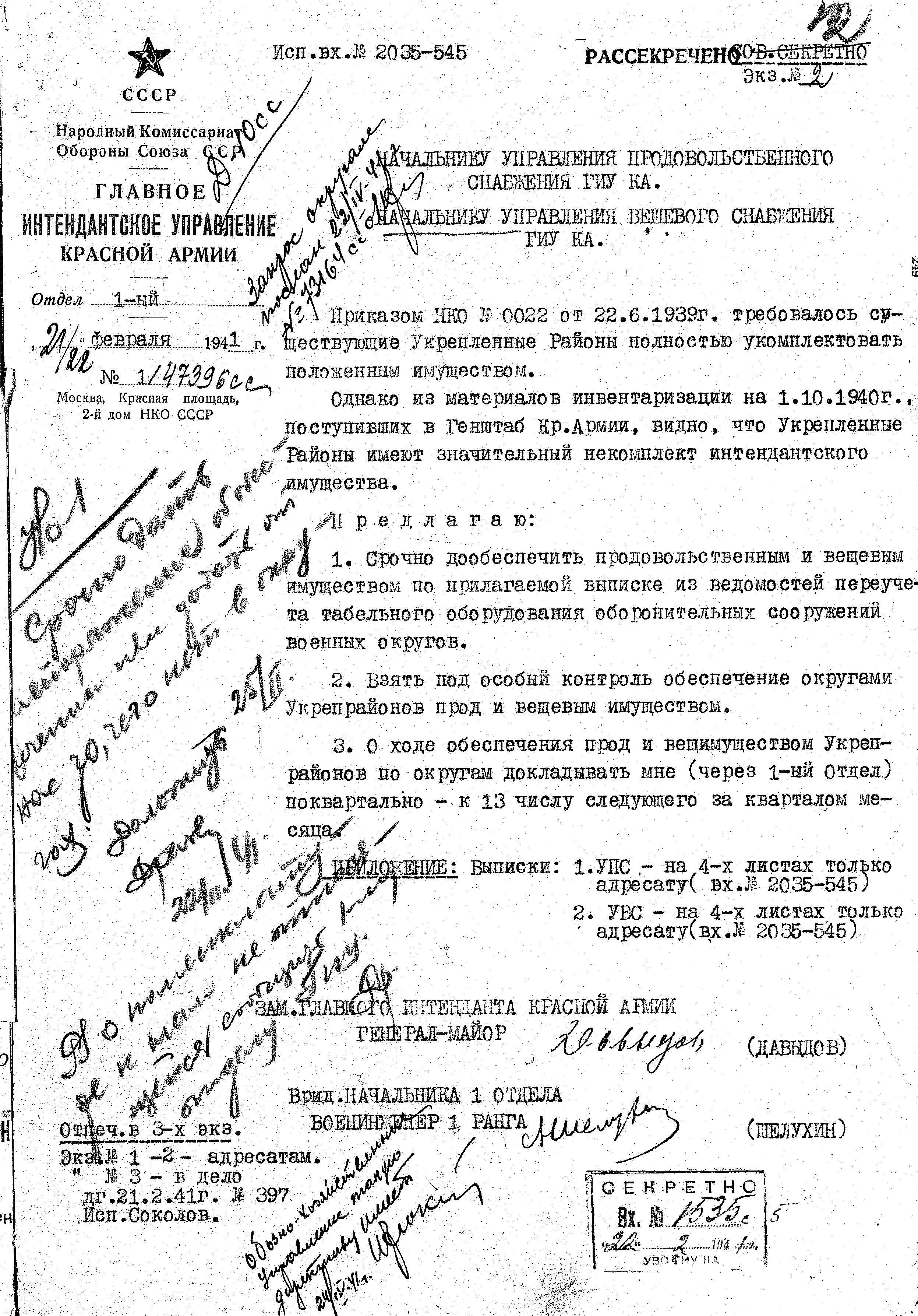 Судя по имеющимся пометкам на каждом листе ведомости, за обеспечение укрепрайонов вещевая служба РККА взялась ответственно и всерьёз. Военным округам был выделен необходимый ресурс материальных средств, началась его поставка, а для того, чтобы имущество было направлено только на обеспечение оборонительных сооружений, в адрес окружных интендантов было направлено вот это указание: