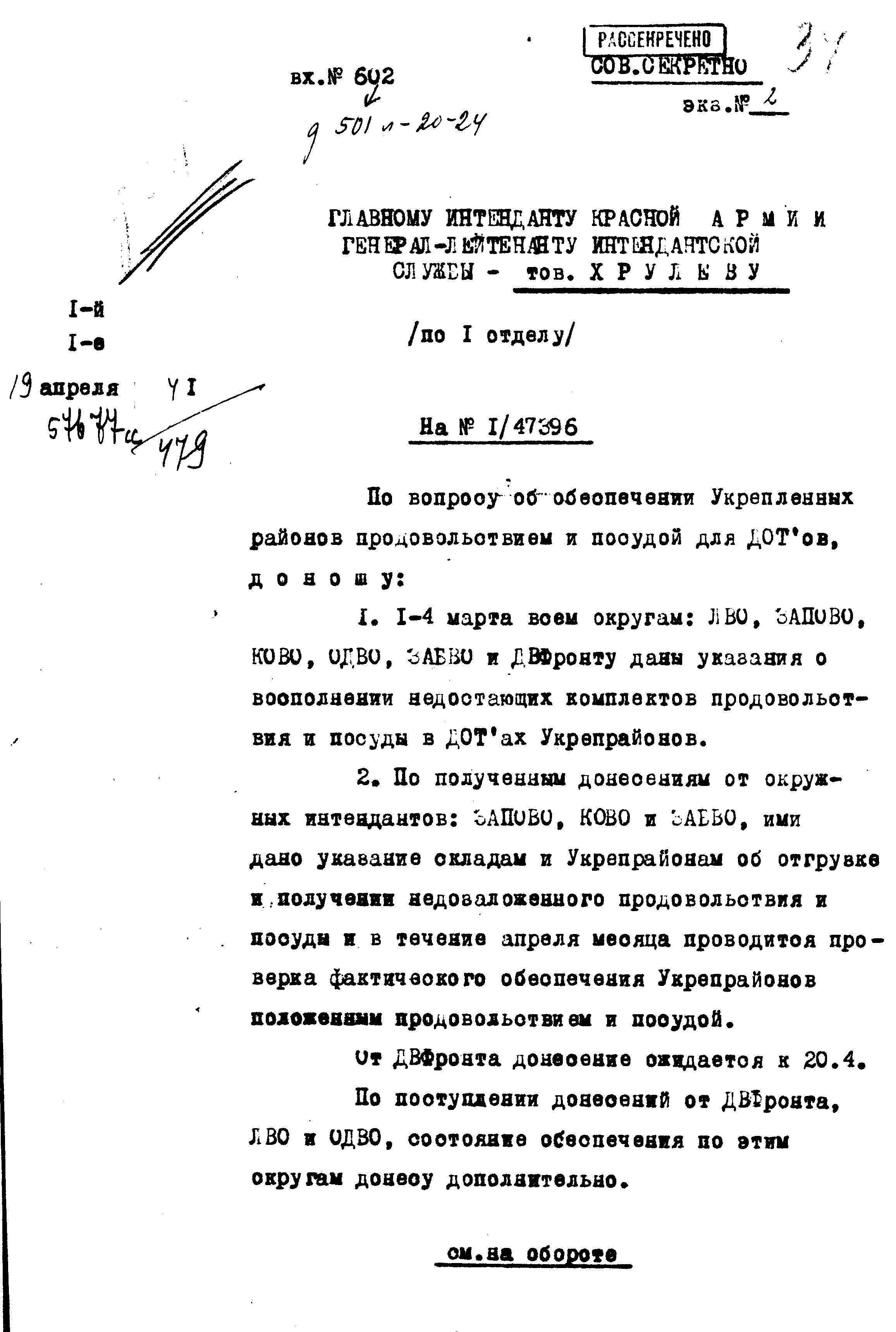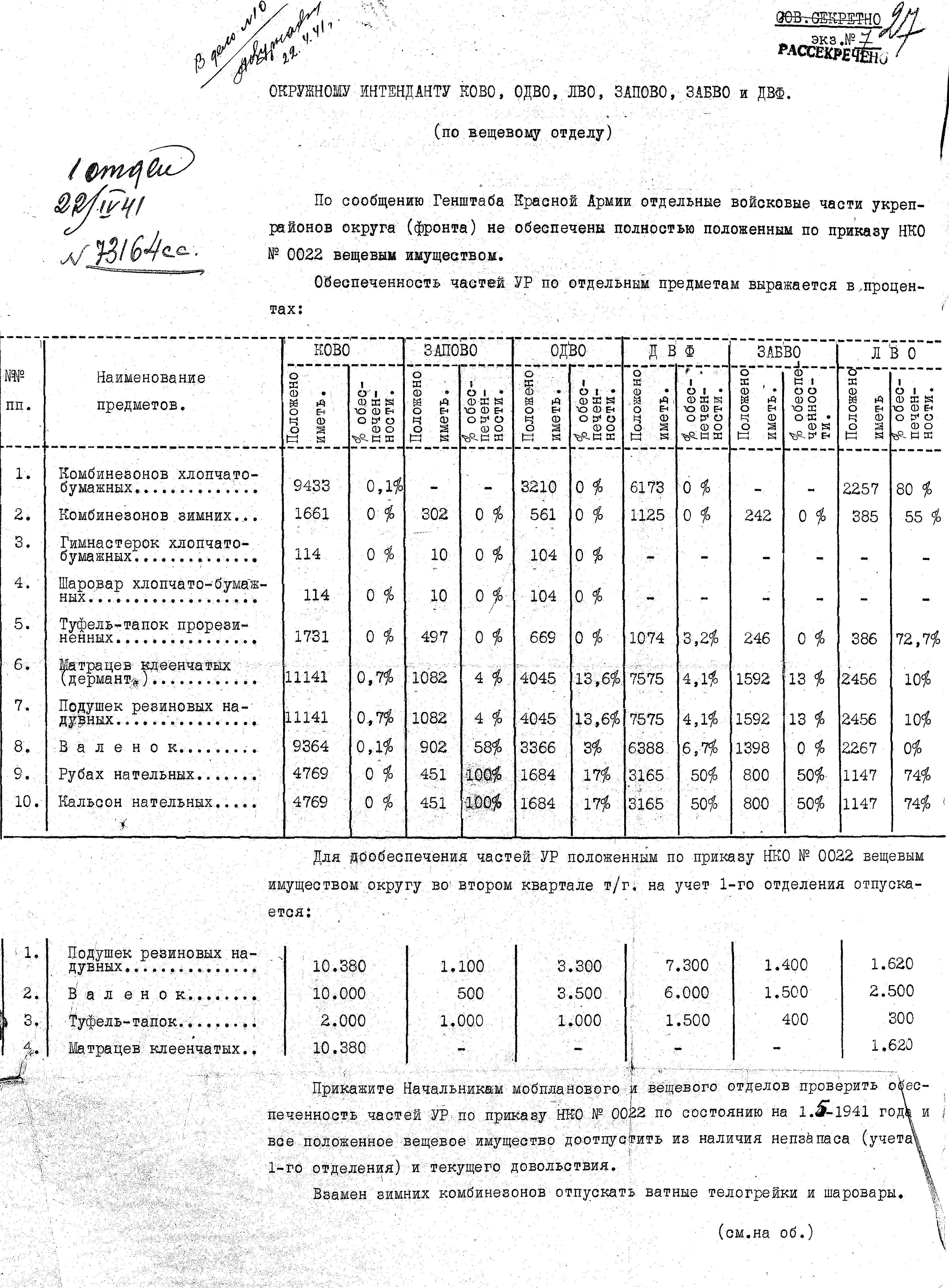 Как бы то ни было, но судя по всему, в Главное Интендантское Управление (ГИУ) сведения поступили только в феврале 1941 г. 21 февраля 1941 года, заместитель Главного Интенданта Красной Армии генерал-майор инт. службы Давыдов, отдал распоряжение начальникам управлений вещевого и продовольственного снабжения по срочному доукомплектованию УРов.