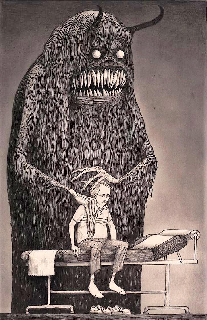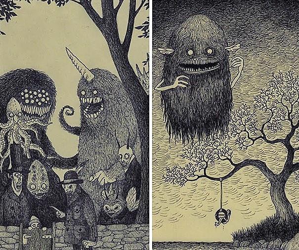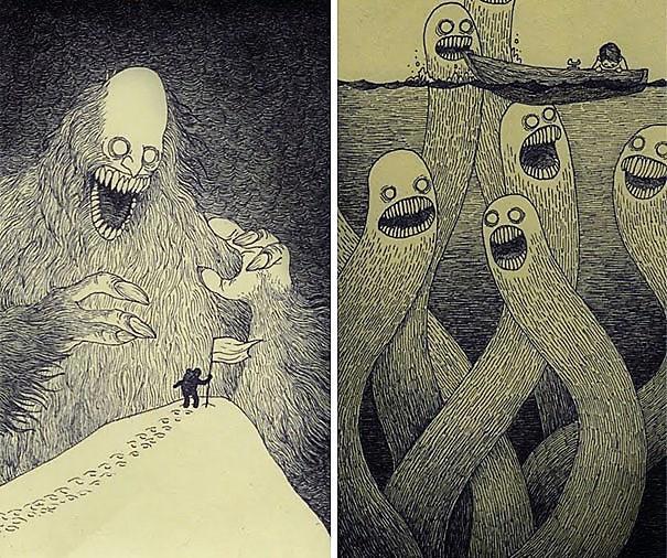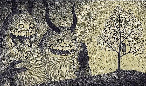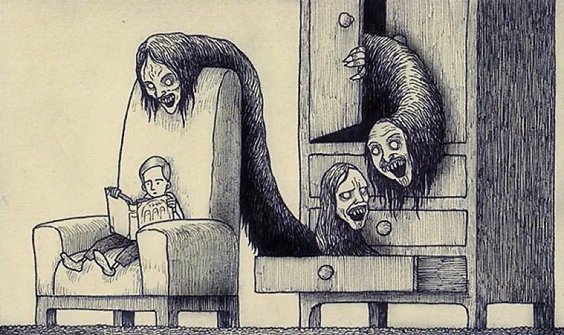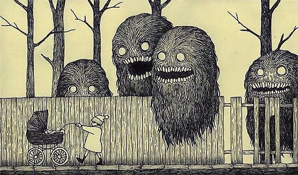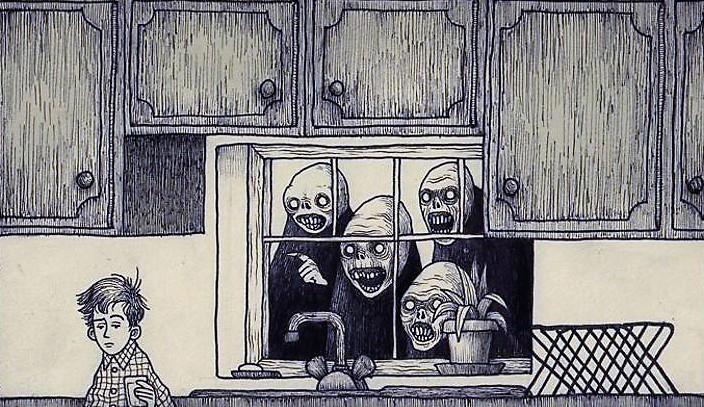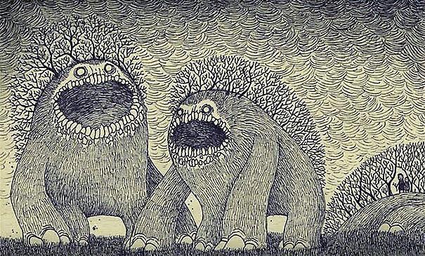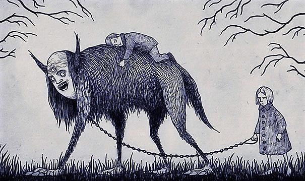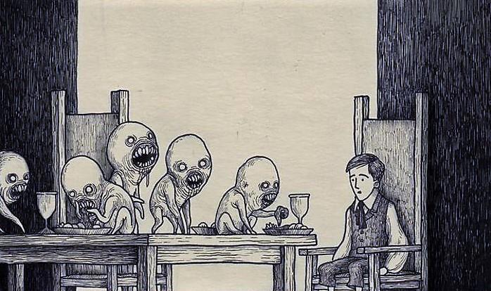 Автор: Мари ПяткинаОчень люблю простые рисунки Йона Кенна Мортенсена. Почему-то меня завораживает это смешное пополам со страшным; эти кусочки одинаково кошмарных снов и явей несчастных, беспомощных обывателей, где чудища, при всей их несерьёзности, выглядят реально, узнаваемо и предельно зловеще.