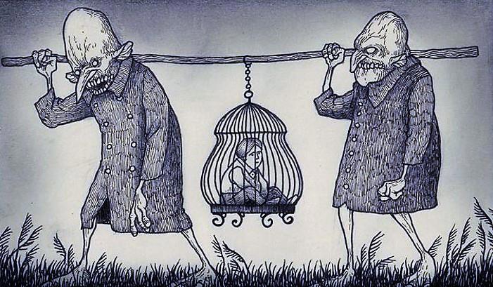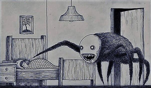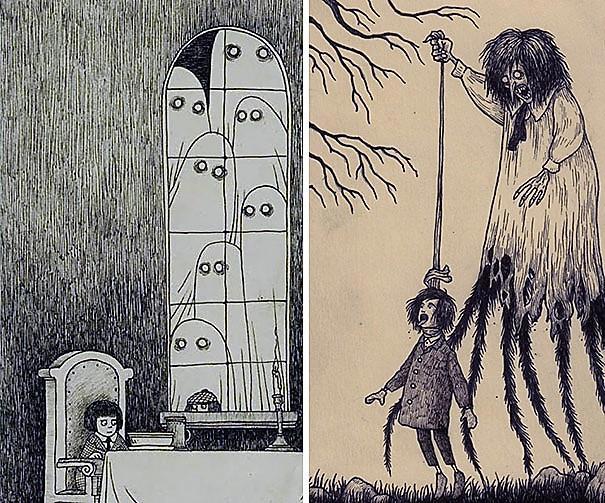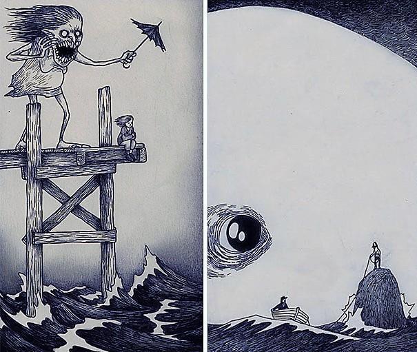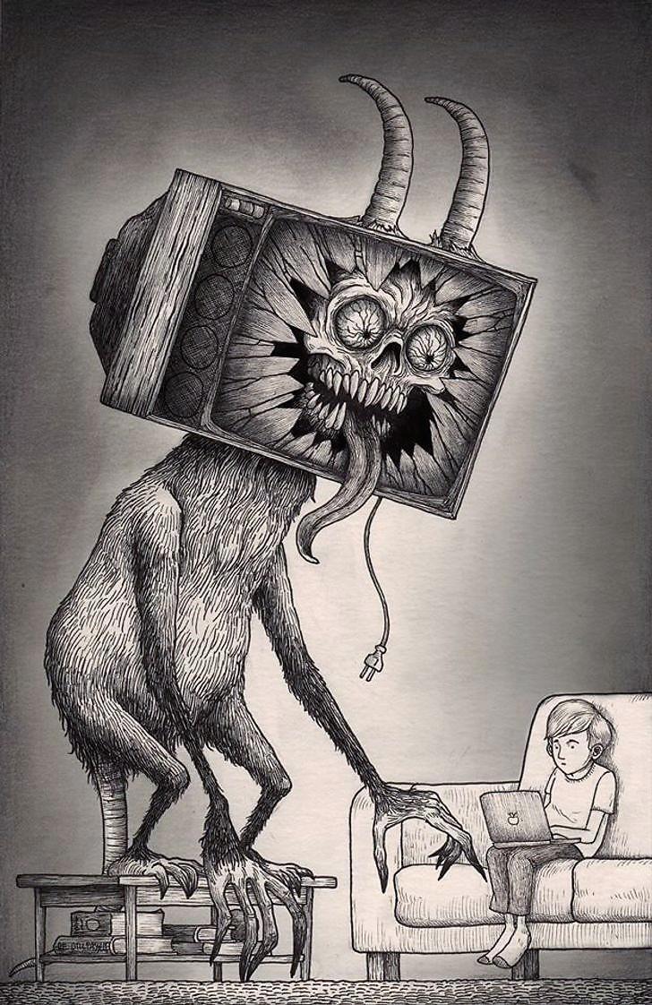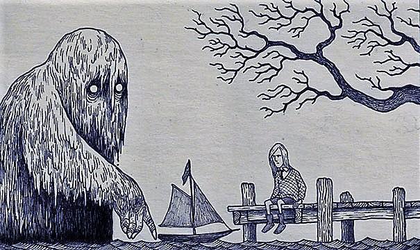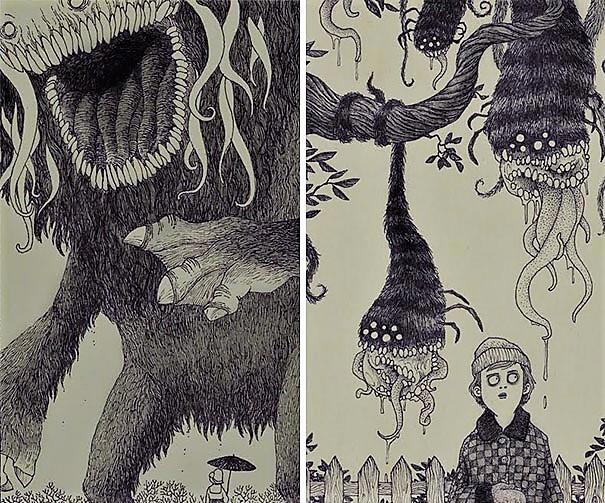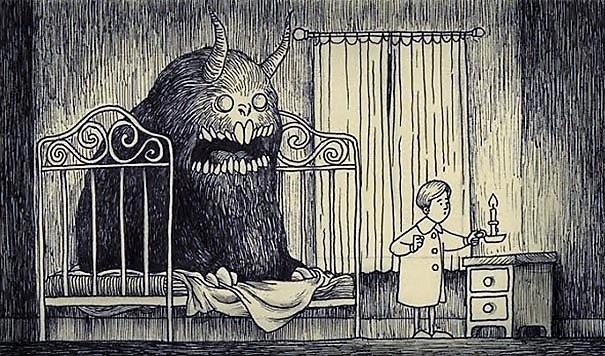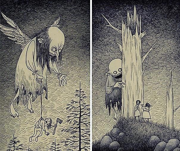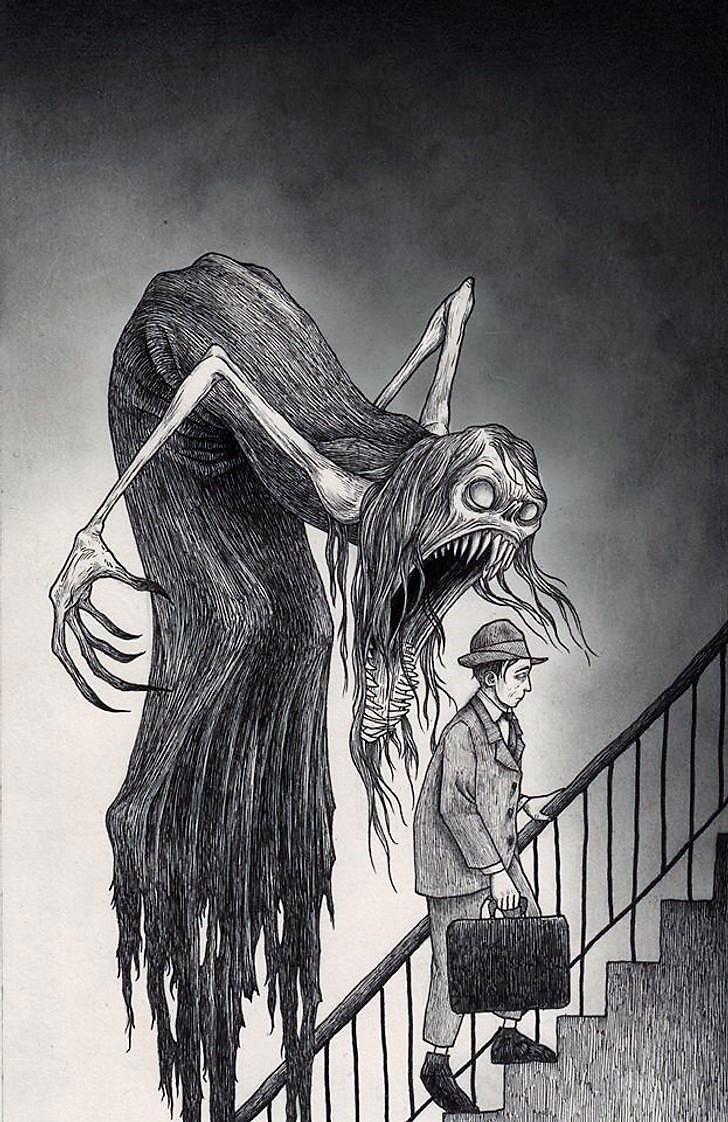 Автор: Мари ПяткинаОчень люблю простые рисунки Йона Кенна Мортенсена. Почему-то меня завораживает это смешное пополам со страшным; эти кусочки одинаково кошмарных снов и явей несчастных, беспомощных обывателей, где чудища, при всей их несерьёзности, выглядят реально, узнаваемо и предельно зловеще.