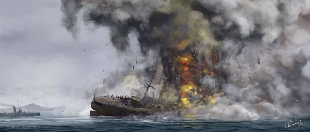 13 апреля (31 марта по ст. стилю) 1904 года, близ гавани Порт-Артура, на выставленной японцами минной банке , в 9.43 подорвался и трагически погиб флагманский корабль Первой Тихоокеанской эскадры РИФ ЭБр "Петропавлоск". На его борту погибли вице-адмирал С. О. Макаров, 10 штабных офицеров , включая начальника штаба контр-адмирала М. П. Моласа,18 корабельных офицеров, 652 матроса и художник-баталист В. В. Верещагин.