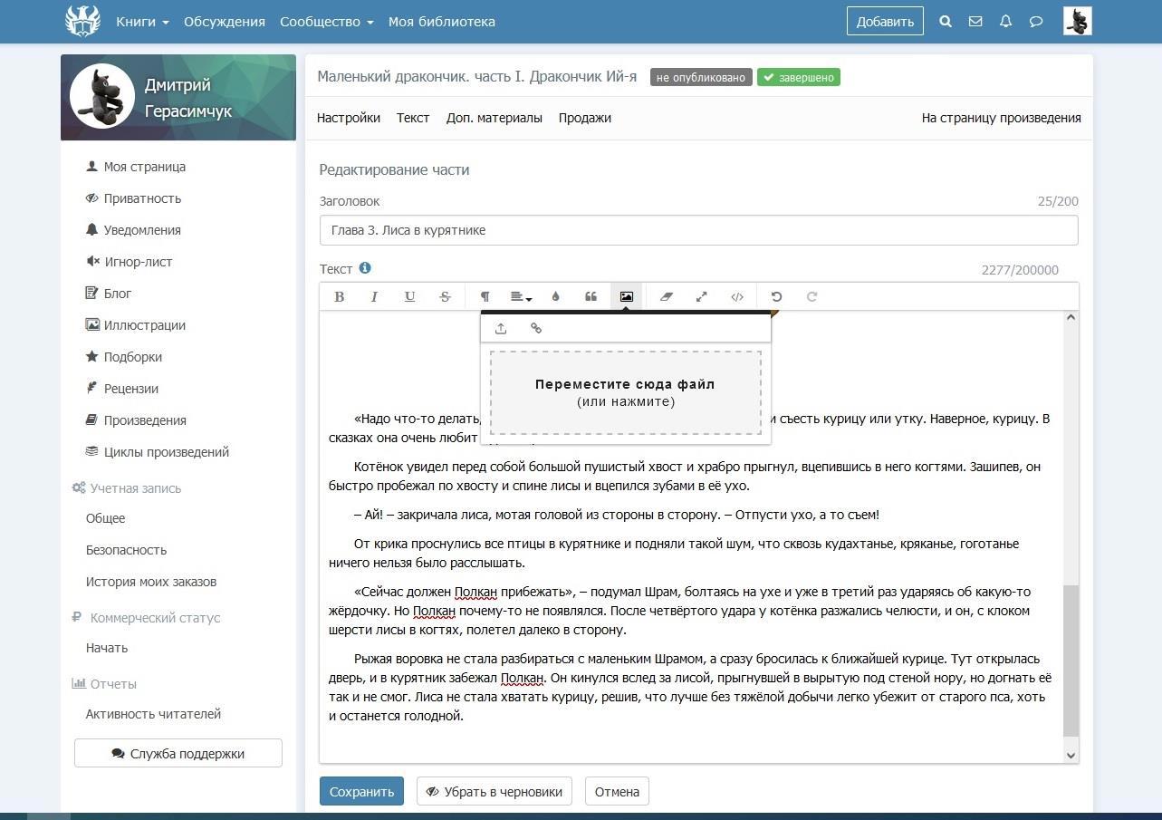Вначале, я не понял, почему текст с офиса без картинок публикуется, а потом нашёл. Сегодня я в сказку "Маленький дракончик" добавил иллюстрации.