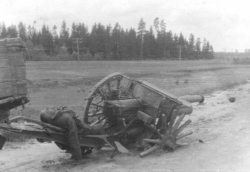 Погибший артиллерист на лафете дивизионной 76,2 мм. пушки