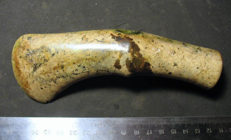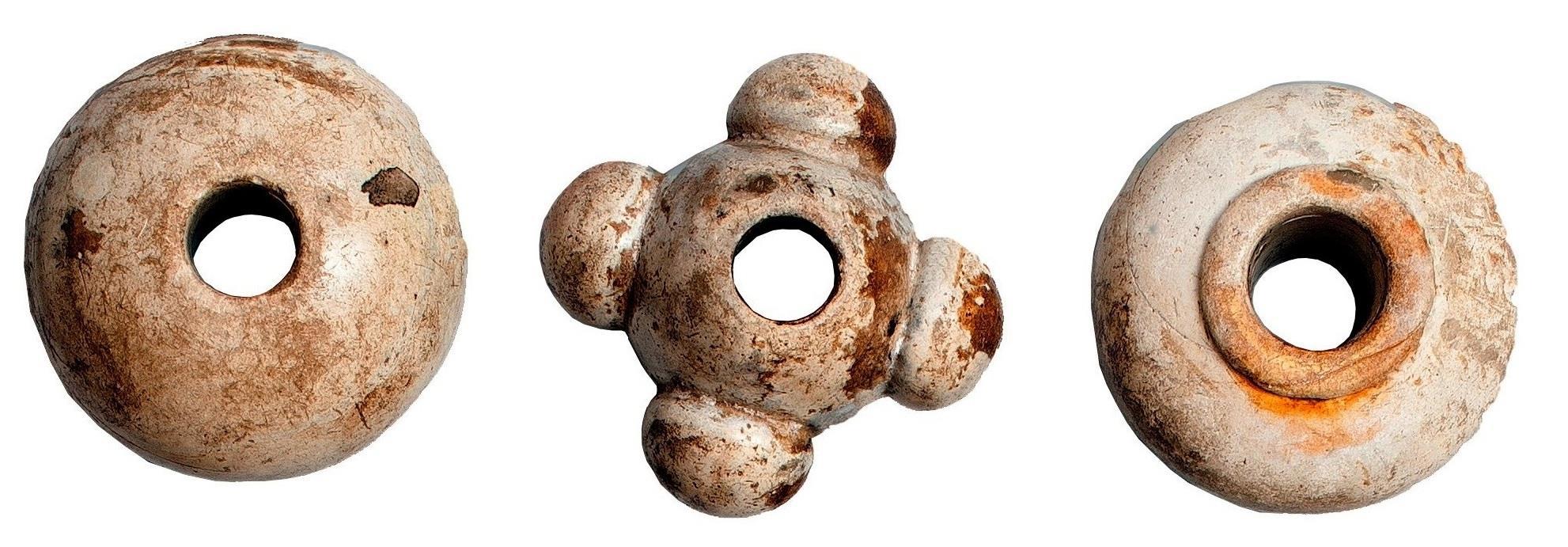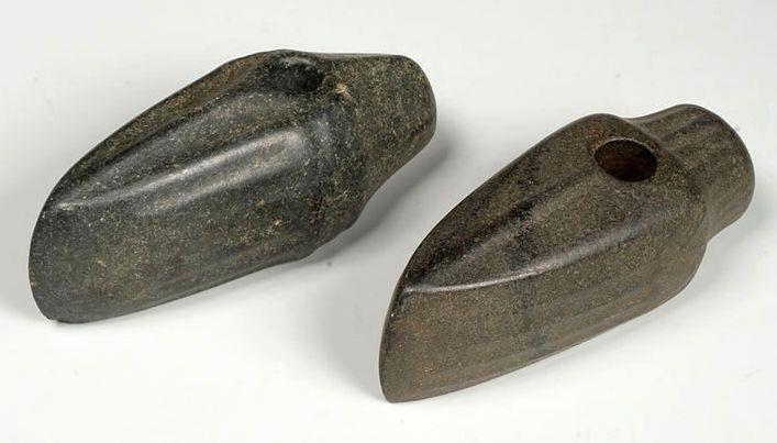Начнём с простого. Три «булавы». Кавычки я поставил, потому что от этих самых орудий ударно-дробящего действия остались лишь головки. Такие булавы из камней разных пород находят довольно часто на обширных территориях Евразии и обычно их относят к памятникам бронзового века. Специалисты говорят, что они сделаны из камня «тальковой породы». Такой материал можно найти на Кавказе и в Саянах. Сделаны очень аккуратно. Посмотрите: