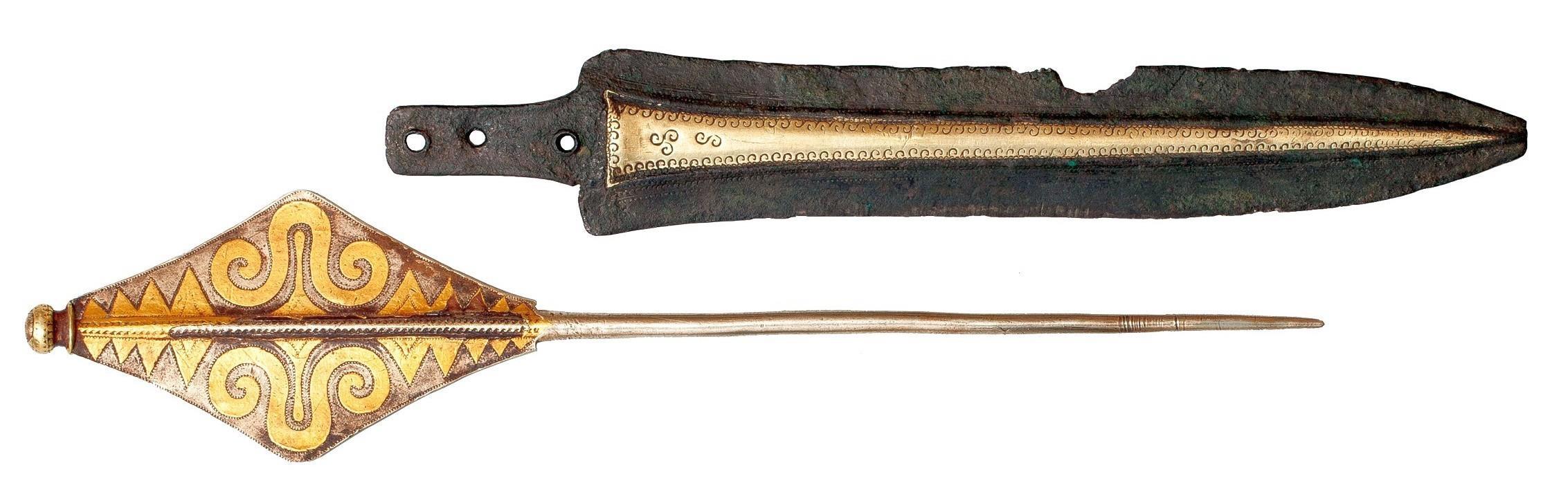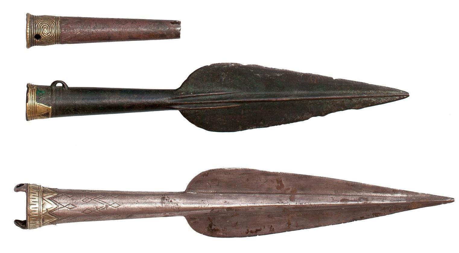 По принципу «от простого к сложному» далее идут копья, то есть в нашем случае — наконечники от копий. Анализ этих изделий позволил уточнить первоначальную датировку по аналогам до 15-16 веков до н.э. Похожие наконечники находили на обширной территории от Чёрного моря до самой Сибири, хотя настолько дорогих и разукрашенных среди них не было. Самый большой наконечник и втулка от сломанного наконечника сделаны из серебра 916 пробы. Вес большого наконечника больше полкилограмма. Третий наконечник массой 280 грамм отлит из сплава серебра и меди (400 проба). Все три изделия инкрустированы листовым золотом 750 пробы, причём по очень продвинутой технологии, позволившей использовать золото по минимуму. Общая технология изготовления одинаковая – наконечники отливали в двухсторонних литейных формах, потом дополнительно обрабатывали для придания «товарного вида». Лезвия дополнительно проковывались, затачивались и даже полировались. Потом дополнительно на них чеканили узоры. Получилось очень красиво: