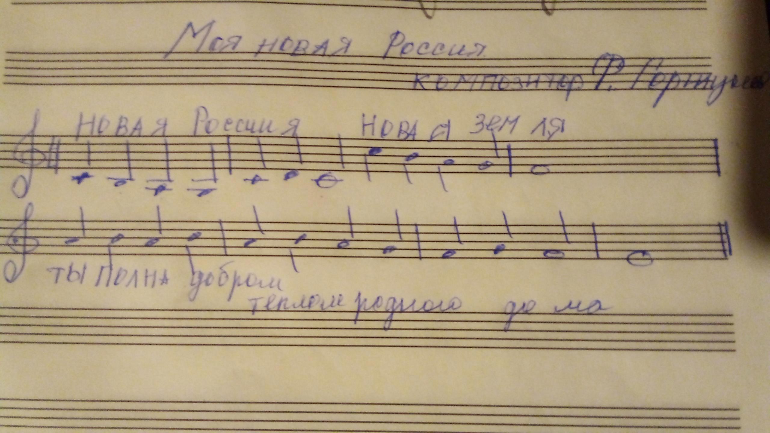 Уже два года он посещает музыкальную школу, и последний год в силу своего развития (неврологи ставят ДЦП) ходил на индивидуальные занятия. Наш педагог Наталья Александровна сразу заметила, что он сочиняет музыку. А с прошлого занятия он принёс ноты с сочиненной им простой песенкой "Моя новая Россия". Нам 8 лет.