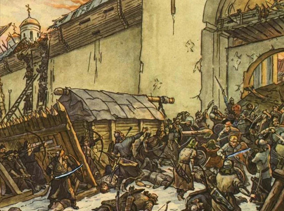 Ну и напоследок - на этой картинке деревянный облам идёт поверху каменной крепости. И штурм идёт именно через пролом (а ещё здесь виден и таран, и штурмовой щит для защиты лучников):