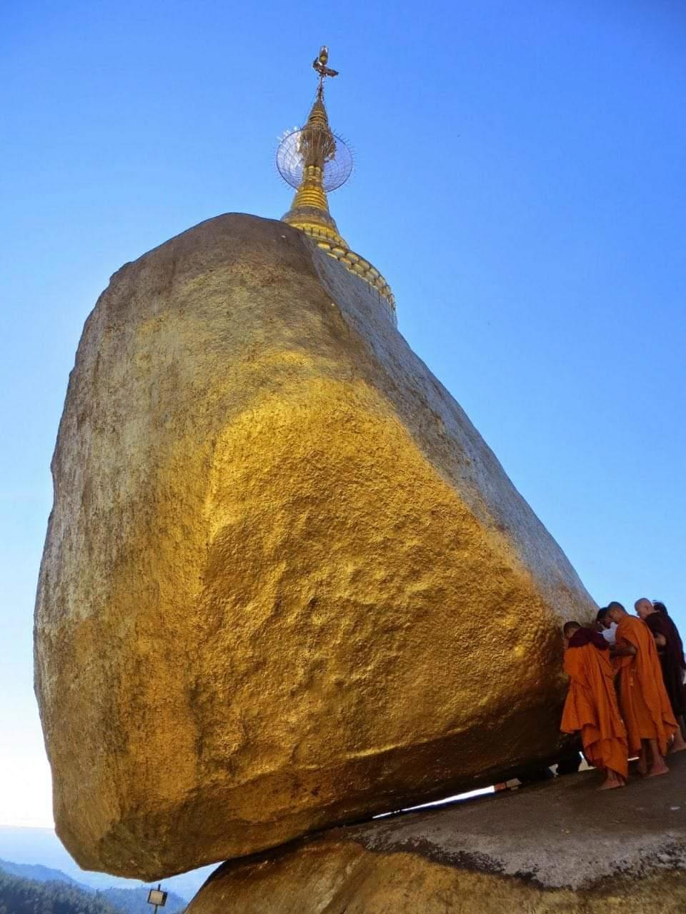 Автор: Алекс НикмарЭтот огромный камень, балансирующий на краю скалы, стал священным местом в Мьянме (Бирме). Восхищённые этим чудом, местные жители и монахи покрыли его сусальным золотом, а на вершине возвели пагоду Чайттийо высота которой 5,5 м. Согласно существующему поверью, в этой пагоде хранится волос Будды, не дающий упасть камню.