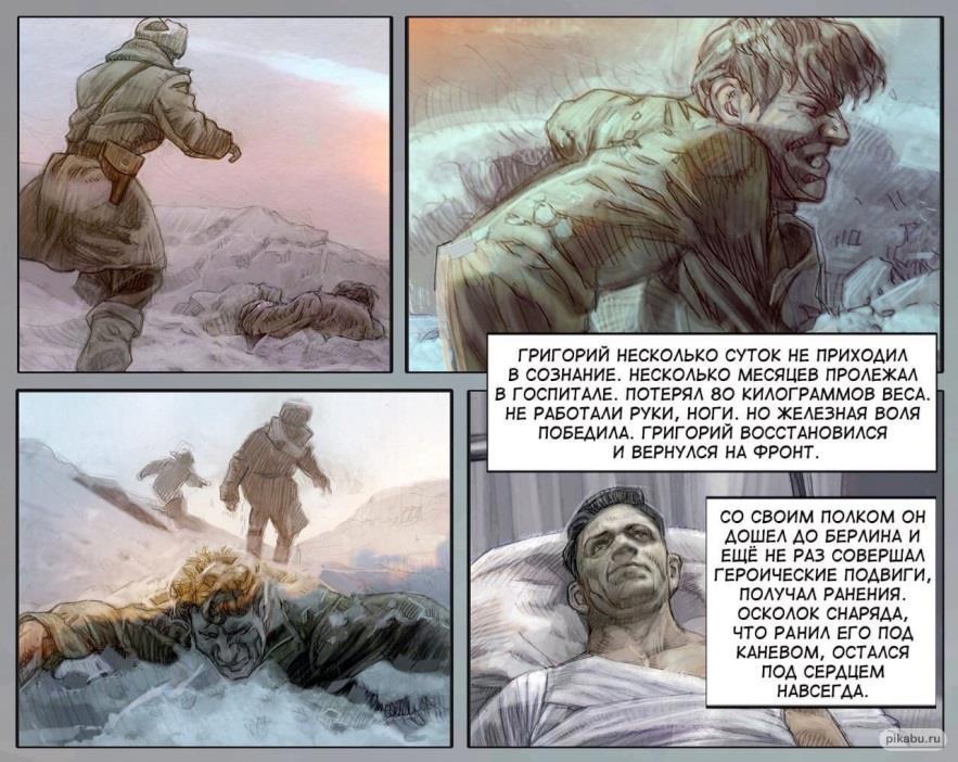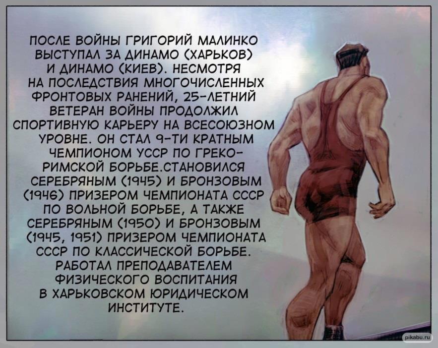 Григорий Васильевич Малинко родился в 1920 году в Харькове. Он был бойцом, многократным призёром чемпионата СССР и чемпионом УССР по классической и вольной борьбе. А Великую Отечественную прошёл как настоящий герой. О паре эпизодов и комикс.