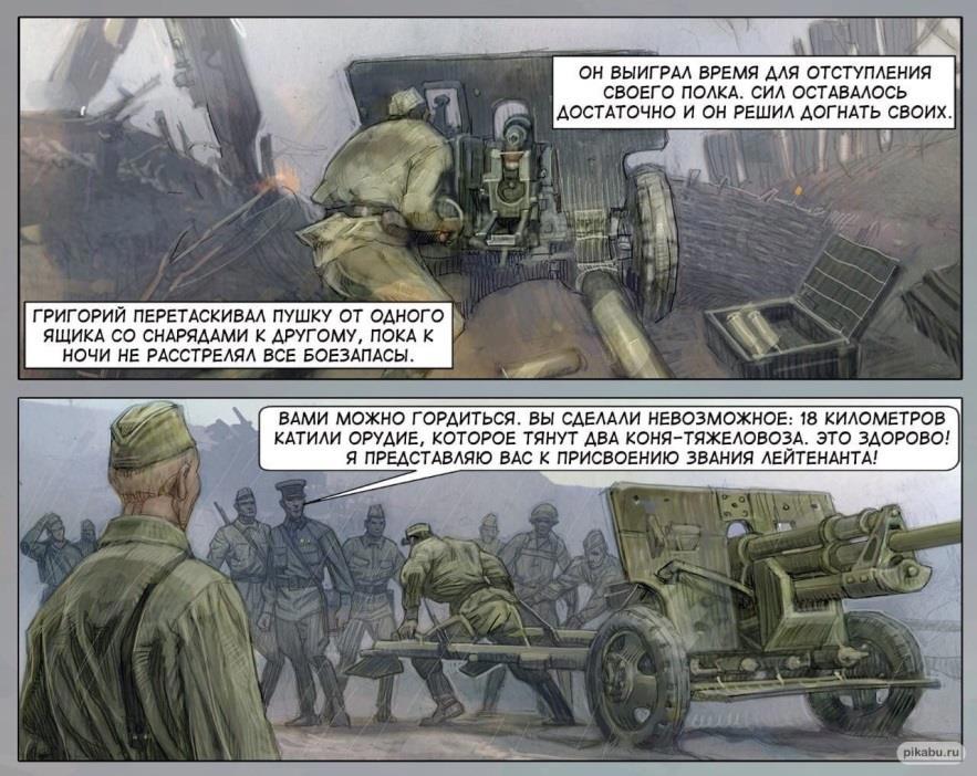 | « | Один из таких случаев произошёл возле Минска. При наступлении наших войск была обнаружена вражеская батарея. Григорий Васильевич незаметно пробрался в тыл и ворвался в траншею врага. От неожиданности расчёты пары немецких орудий подняли руки и начали сдаваться. Для пущей убедительности наш герой взял в руки гранату, залез на дуло одного из орудий и на понятном для всех русском языке начал призывать активней сдаваться и становиться в шеренгу. Сам того не ожидая, он услышал как недалеко от батареи с деревьев начали спрыгивать замаскированные немцы. Они послушно спускались с деревьев, бросали оружие и становились к другим пленным. Григорий Васильевич, конечно, не выдавал своих эмоций, но внутри у него был огромное волнение. А как ему не быть -- перед ним одним выстроилась колонна пленных. Только после передачи пленных Малинко расслабился и вместе с товарищами порадовался за удачно выполненное задание. Ну вообще-то здоровяк в 130 кило весом мог нагнать страху. | » |